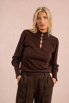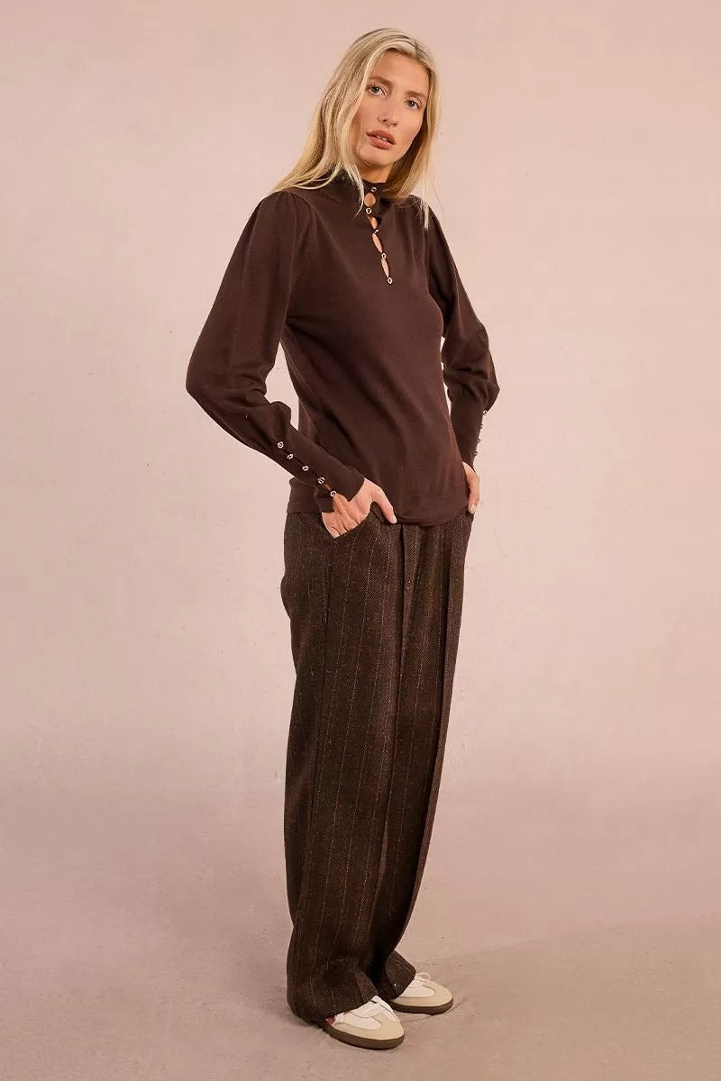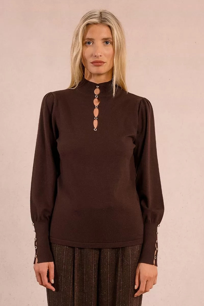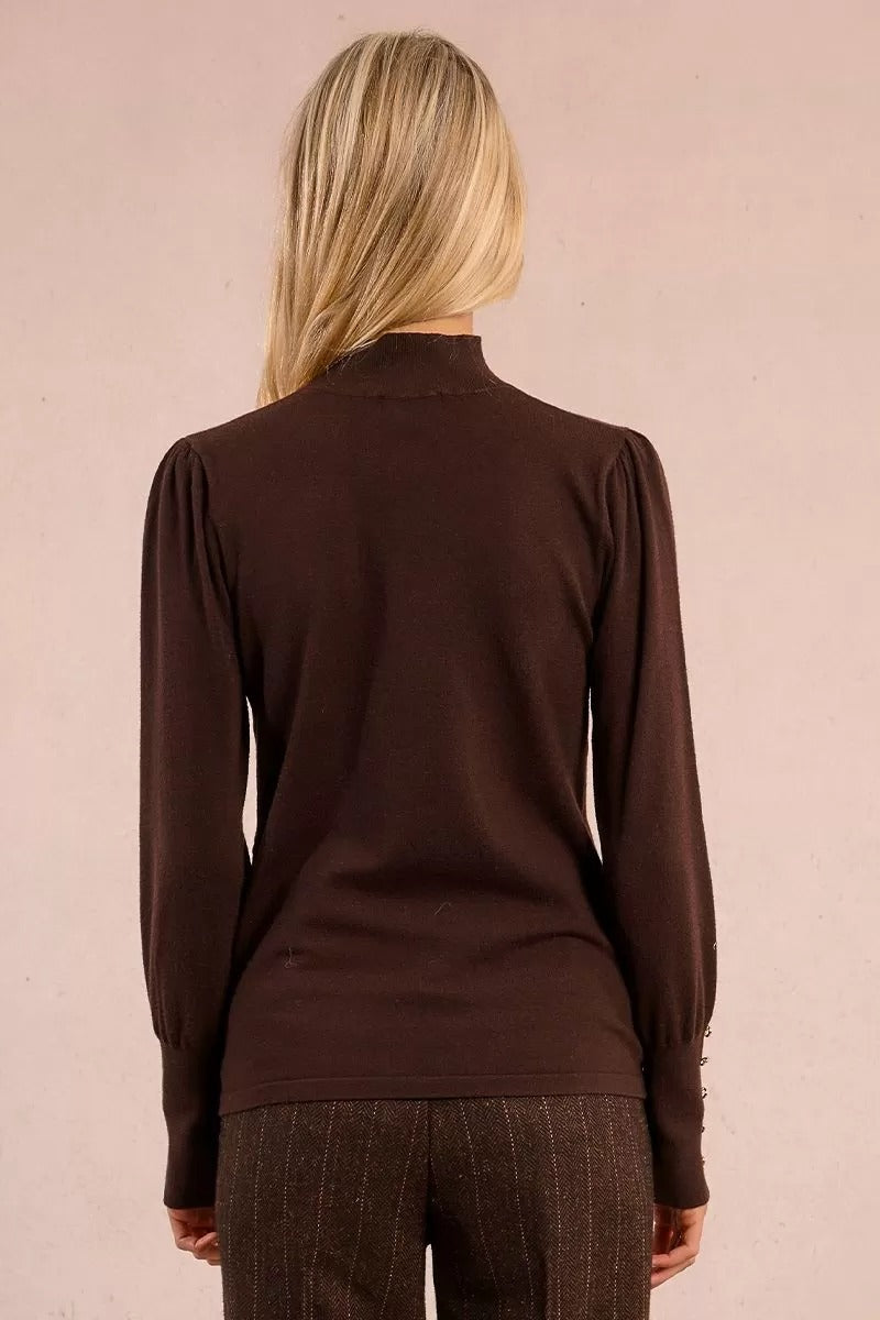 Maglia donna sottile in maglia, vestibilità slim spalla arricciata maniche lunghe a palloncino, perline decorative sui polsini