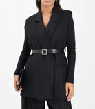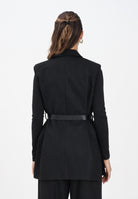 VICOLO Gilet nero da donna in tessuto gessato con leggera trama luminosa. Ha revers classico, linea dritta e senza maniche, chiusura incrociata regolata da una cintura in vita in pelle nera con fibbia rettangolare. Presenta due tasche a filetto sul davanti che completano il design essenziale ed elegante. Un capo versatile, perfetto da indossare sopra camicie o dolcevita per look formali e sofisticati. La modella indossa una taglia S ed è alta 170cm. Si consiglia una stiratura a media temperatura. Stagione autunno inverno.