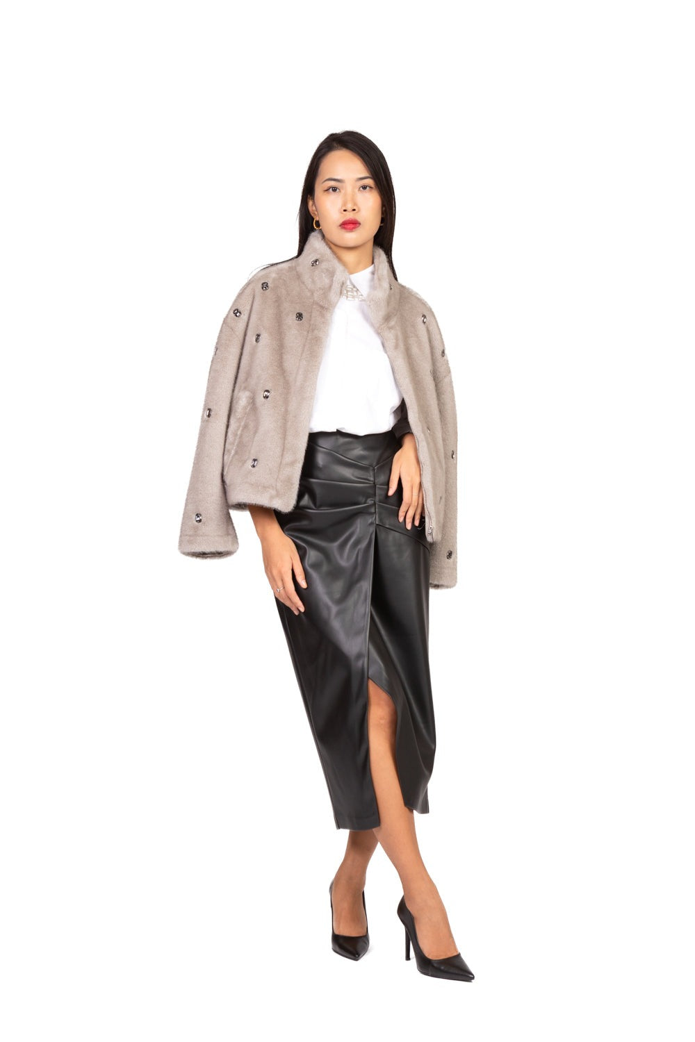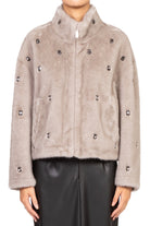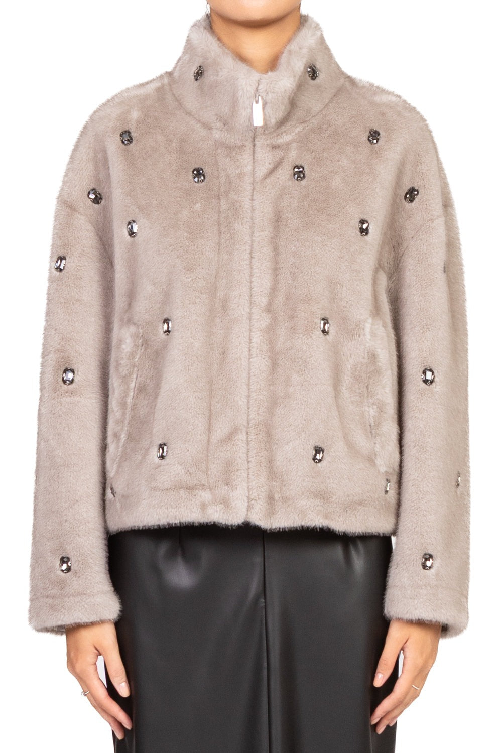 Giacca in pelliccia corta dal fascino glamour, impreziosita da applicazioni gioiello che donano luce e personalità al capo. La chiusura con zip frontale garantisce praticità mantenendo una linea moderna e sofisticata. Completano il design le tasche laterali, discrete e funzionali. Un capo statement, perfetto per elevare anche il look più semplice con un tocco di eleganza scintillante.