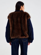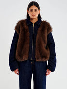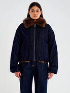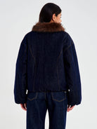 Bomber in denim raw maniche lunghe con colletto e coulisse sul fondo. Collo in ecopelliccia. Chiusura frontale con zip in metallo. Tasche laterali alla francese. Dettaglio ecopelliccia effetto gilet nella parte interna. Il capo può essere indossato in entrambi i lati.