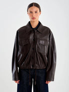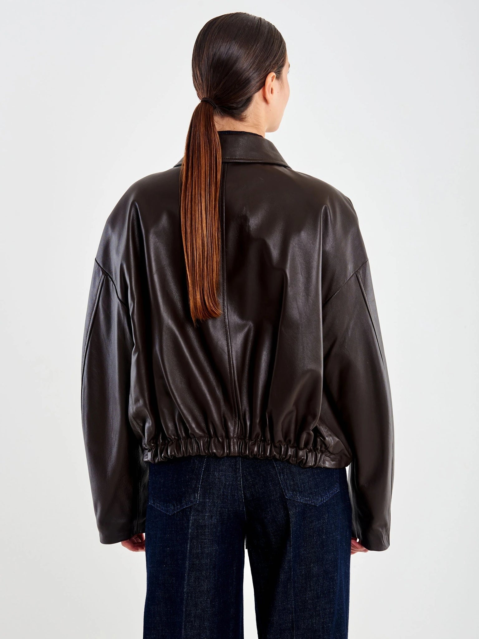 Giacca in vera pelle, modello bomber con elastico sul fondo, maniche lunghe e colletto. Chiusura frontale con bottoni e tasche laterale con patta. Vestibilità ampia.