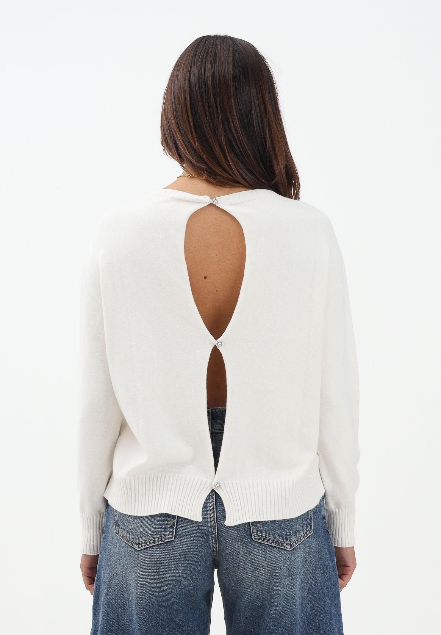 VICOLO Maglioncino girocollo da donna dal design raffinato e moderno. Presenta un taglio morbido con scollo tondo e maniche lunghe, rifinite da polsini e fondo a costine. La particolarità del capo è la parte posteriore: un'apertura a goccia con chiusura a bottoncino sul collo e due ulteriori bottoni centrali che lasciano intravedere la schiena in modo elegante e femminile. Un capo versatile che unisce comfort e stile, perfetto sia per look casual chic che per outfit più ricercati. Si consiglia un lavaggio a mano ed una stiratura a media temperatura. Stagione autunno inverno.
