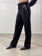 VICOLO Pantalone elegante da donna. Realizzati in tessuto fluido, presentano una vestibilità dritta e gambe larghe che slanciano la figura e garantiscono comfort. La vita a vita media con passanti per cintura e chiusura con bottone e zip assicura una vestibilità classica, mentre la banda laterale in raso tono su tono aggiunge un dettaglio luminoso e raffinato, perfetto per aggiungere un tocco di originalità al design. Questi pantaloni versatili possono essere abbinati a una giacca abbinata per un outfit audace, oppure a bluse e camicie per outfit più moderni e femminili. La modella indossa una taglia S ed è alta 170 cm. Si consiglia una stiratura a fuoco medio. Stagione autunno/inverno.