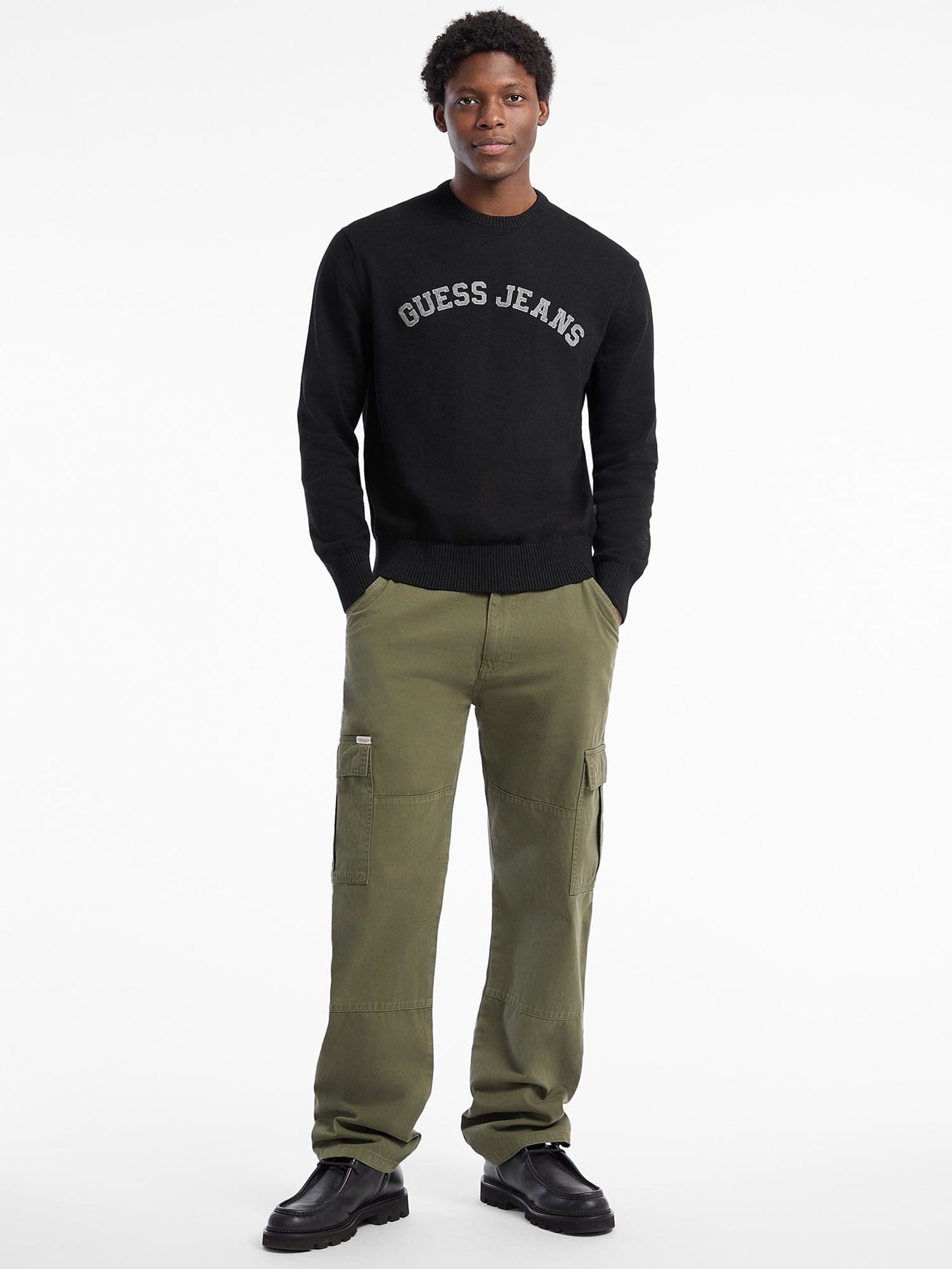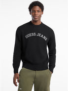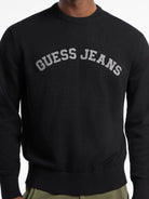Guess Jeans Eclettico urban con fascino rilassato. Maglione in cotone con girocollo e maniche lunghe, logo ricamo oversize. Realizzato in cotone organico, una scelta eco-sostenibile.
