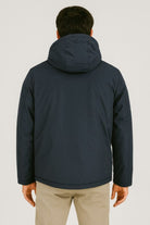 Giubbino uomo imbottito i tasche laterali e cerniera centrale con bordo in similpelle con maniche lunghe e cappuccio con coulisse regolabile
