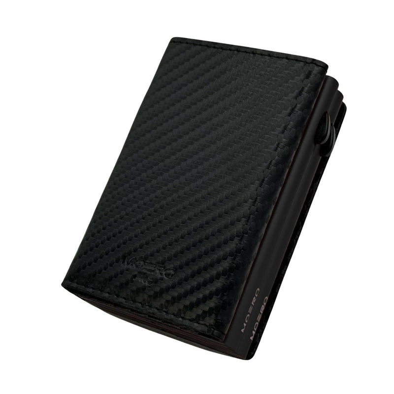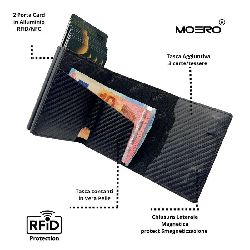 contiene fino a 12 carte, 5/6 nel portacarte di alluminio e altre 6 divise nelle due tasche inter