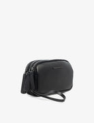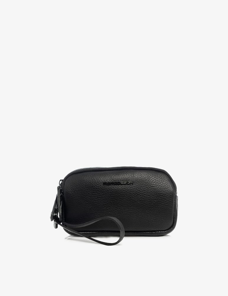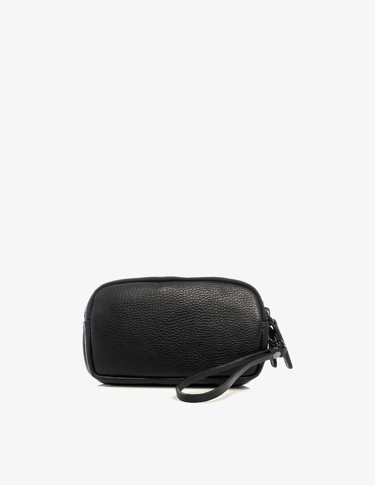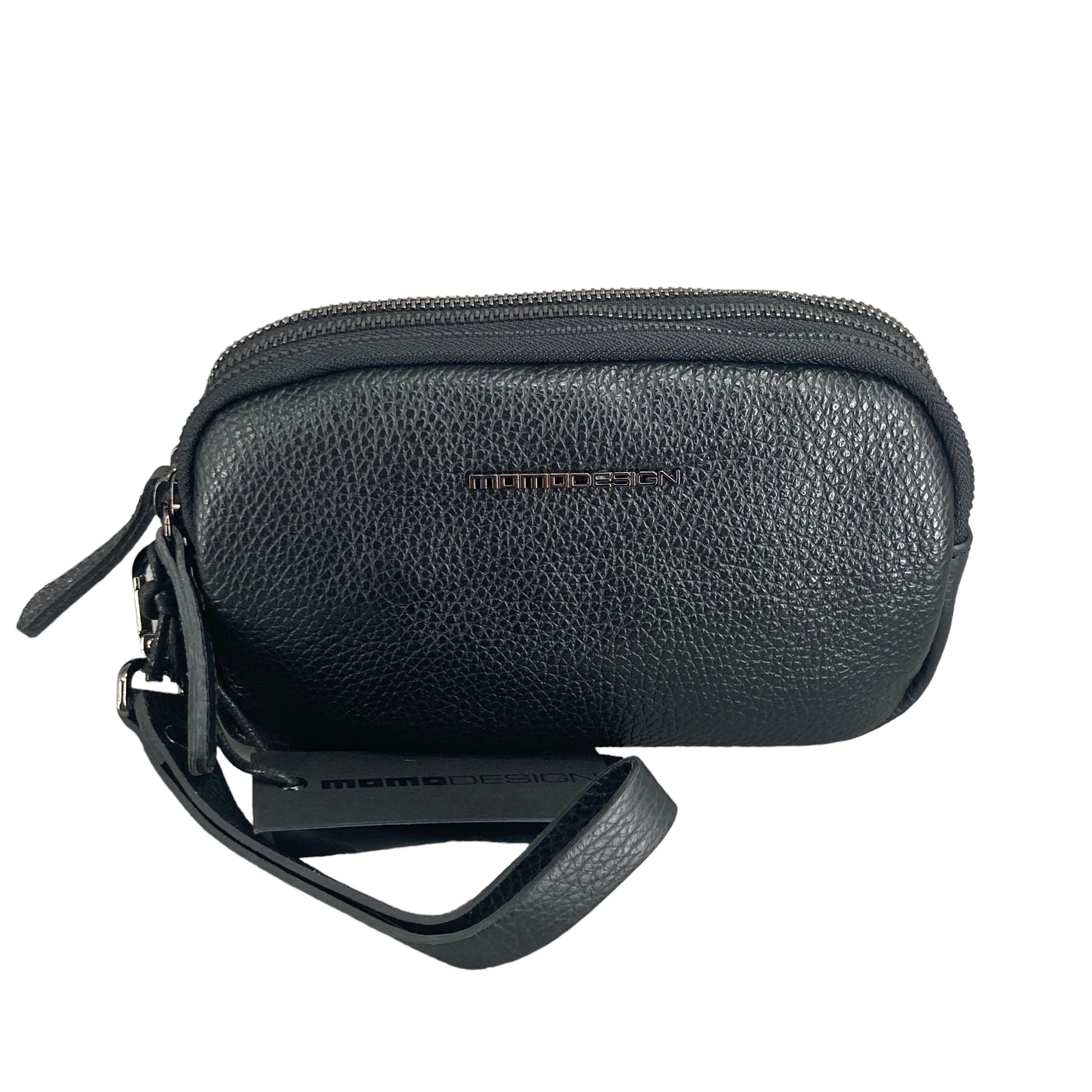 Pochette uomo in similpelle martellata di colore nero, modello con manico removibile, chiusura con tre cerniere e logo Momo Design in metallo sul fronte