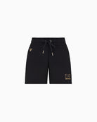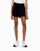Shorts donna realizzati in misto viscosa stretch, dallo stile rilassato e confortevole dotati di due tasche laterali e coulisse in vita. Un modello che si distingue per la personalizzazione del logo EA7 sul fondo e dal logo Eagle sul fianco sinistro, entrambi realizzati in micro borchie oro che donano un tocco luminoso, che richiama sia i pantaloni che le felpe della stessa linea