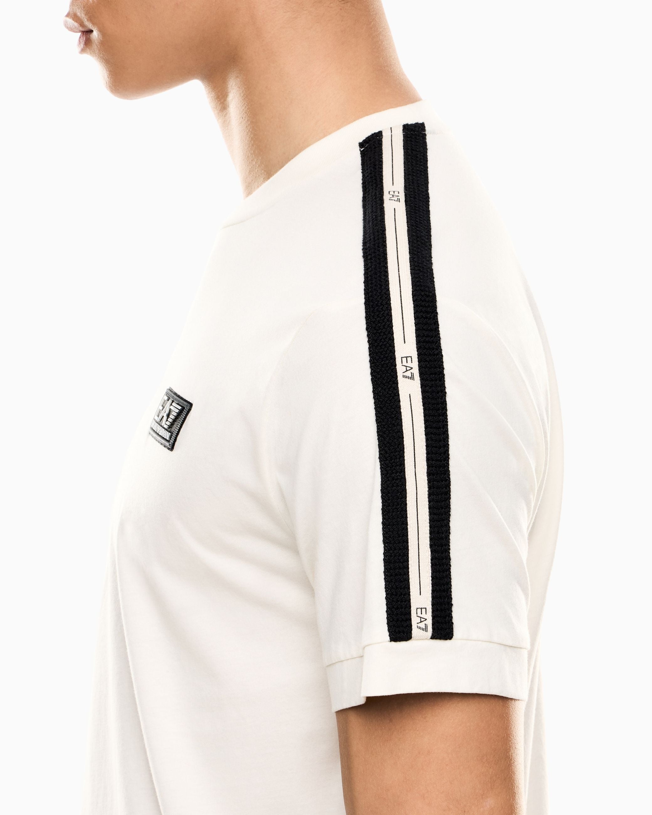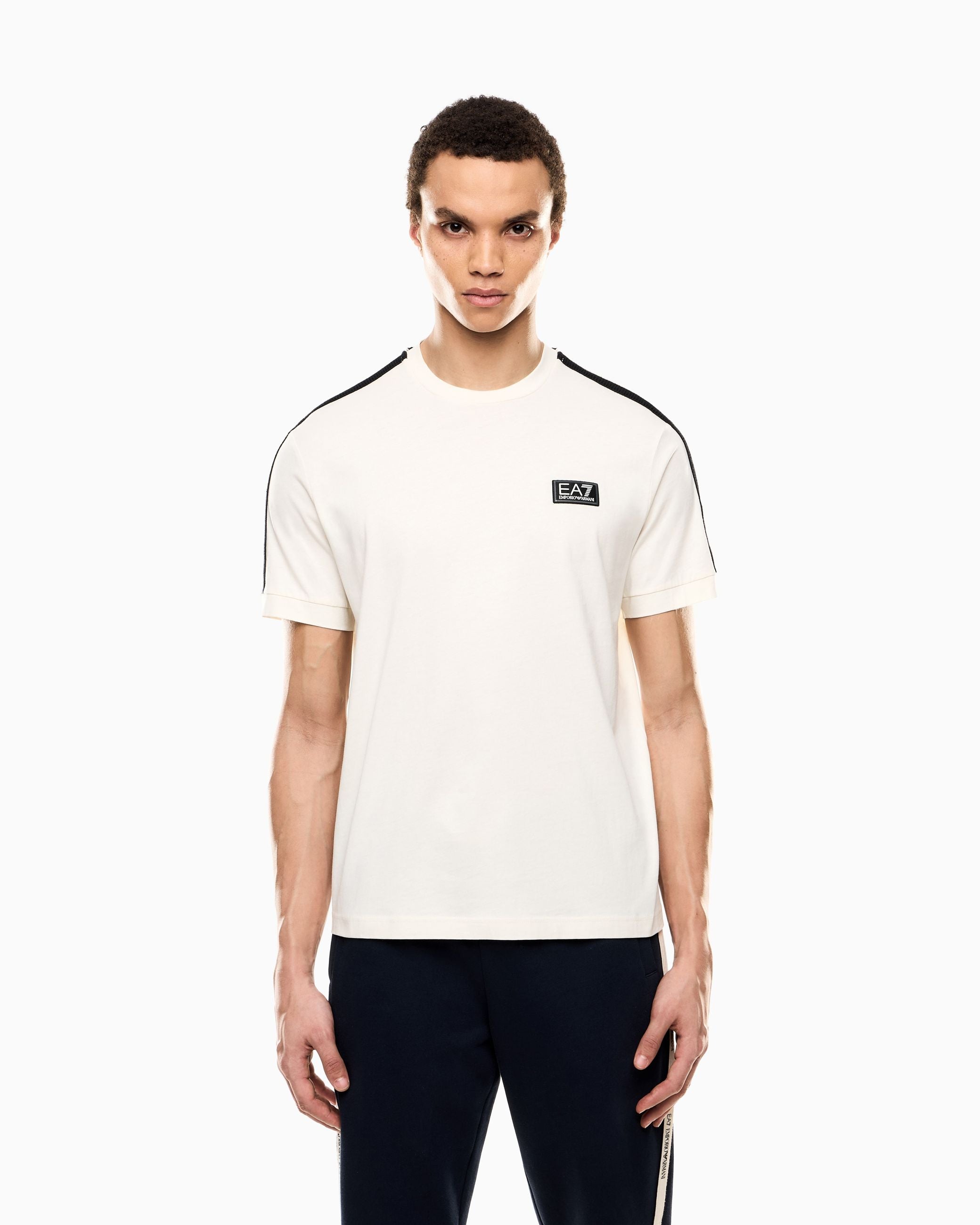 T-shirt uomo girocollo realizzata in morbido jersey di cotone, dalla vestibilità regular. Il modello è personalizzato dal dettaglio con logo tape sulle spalle e dal logo EA7 sul petto, che riprende altri creazioni della linea Logo Series.