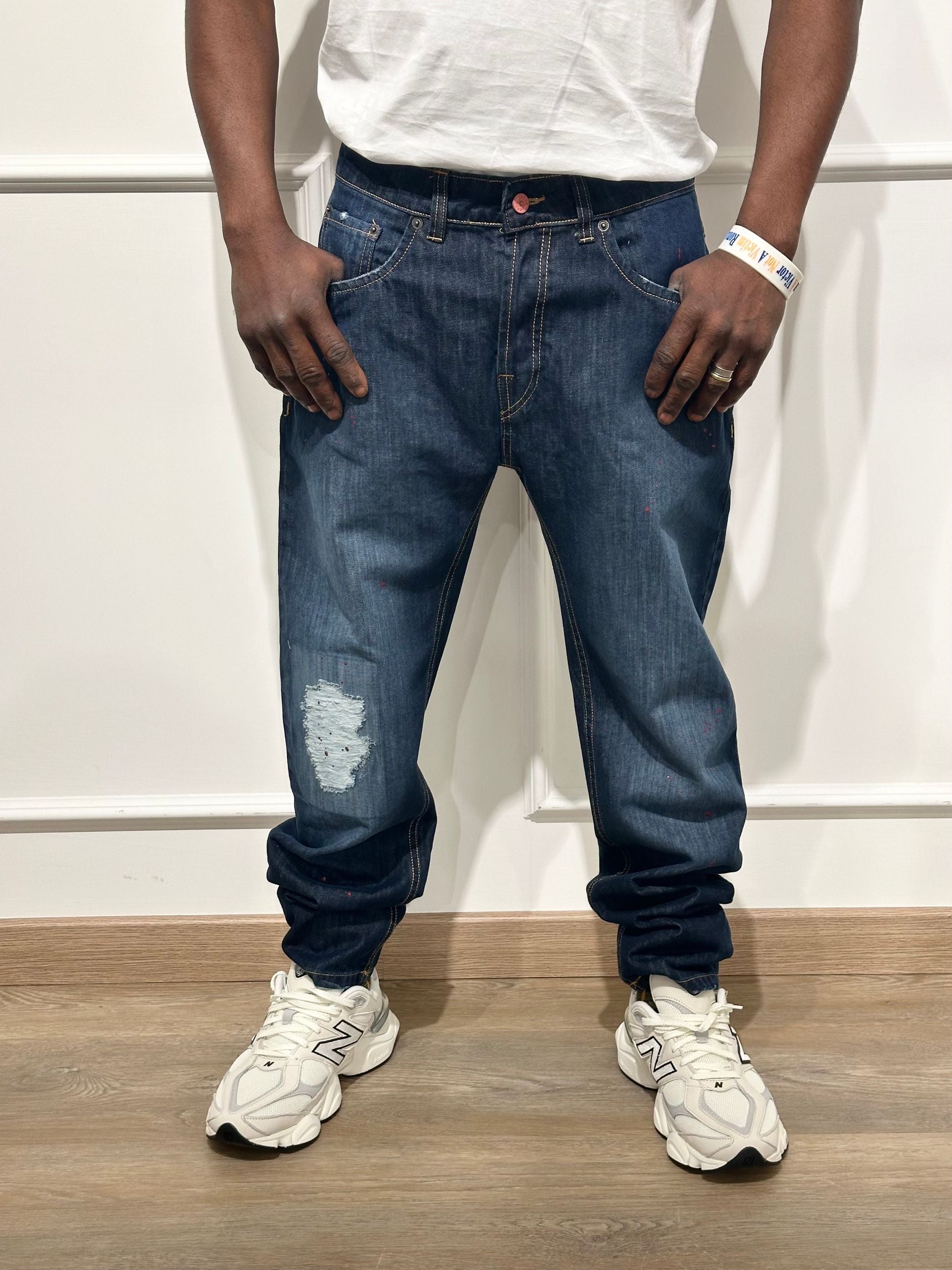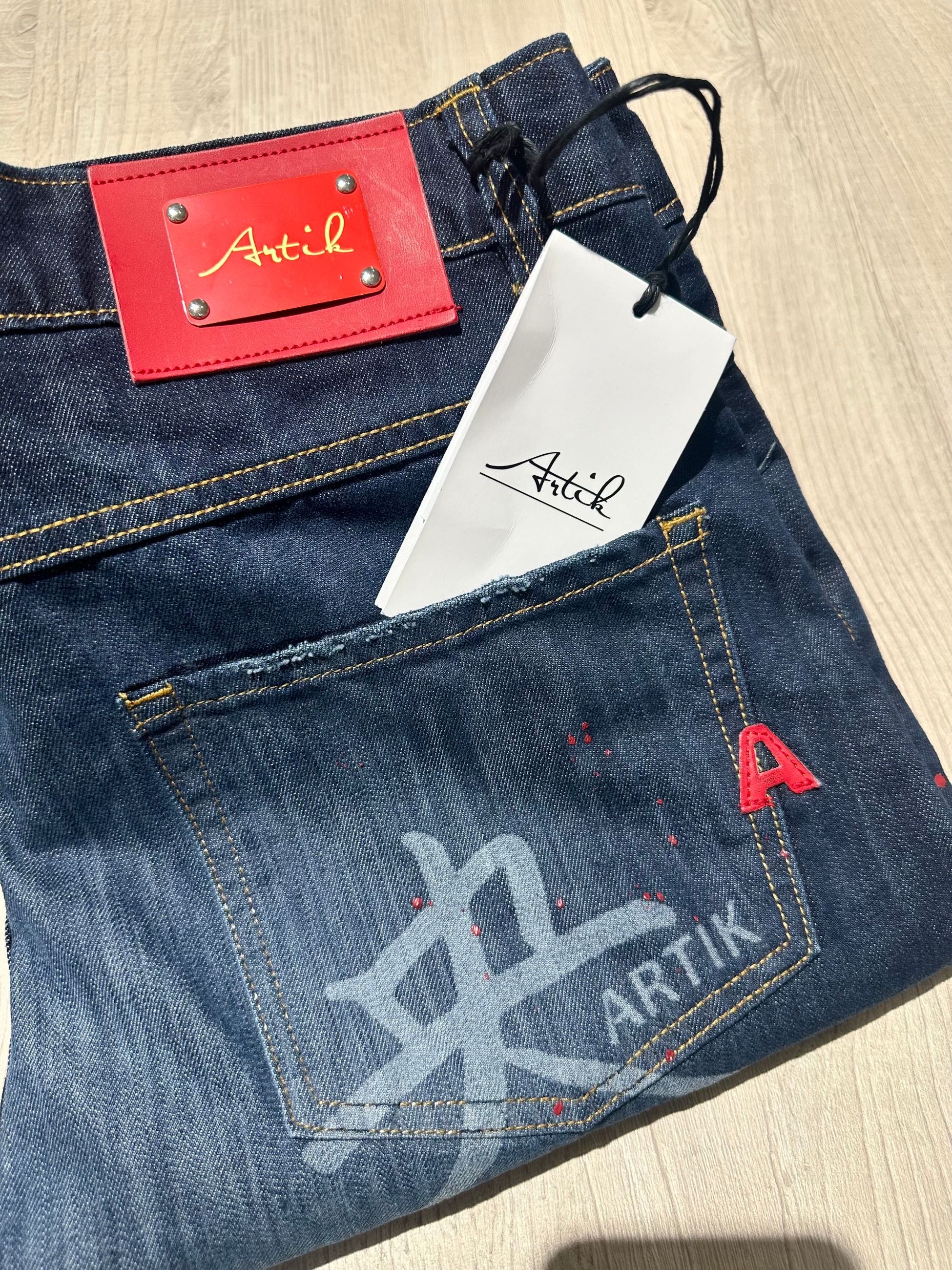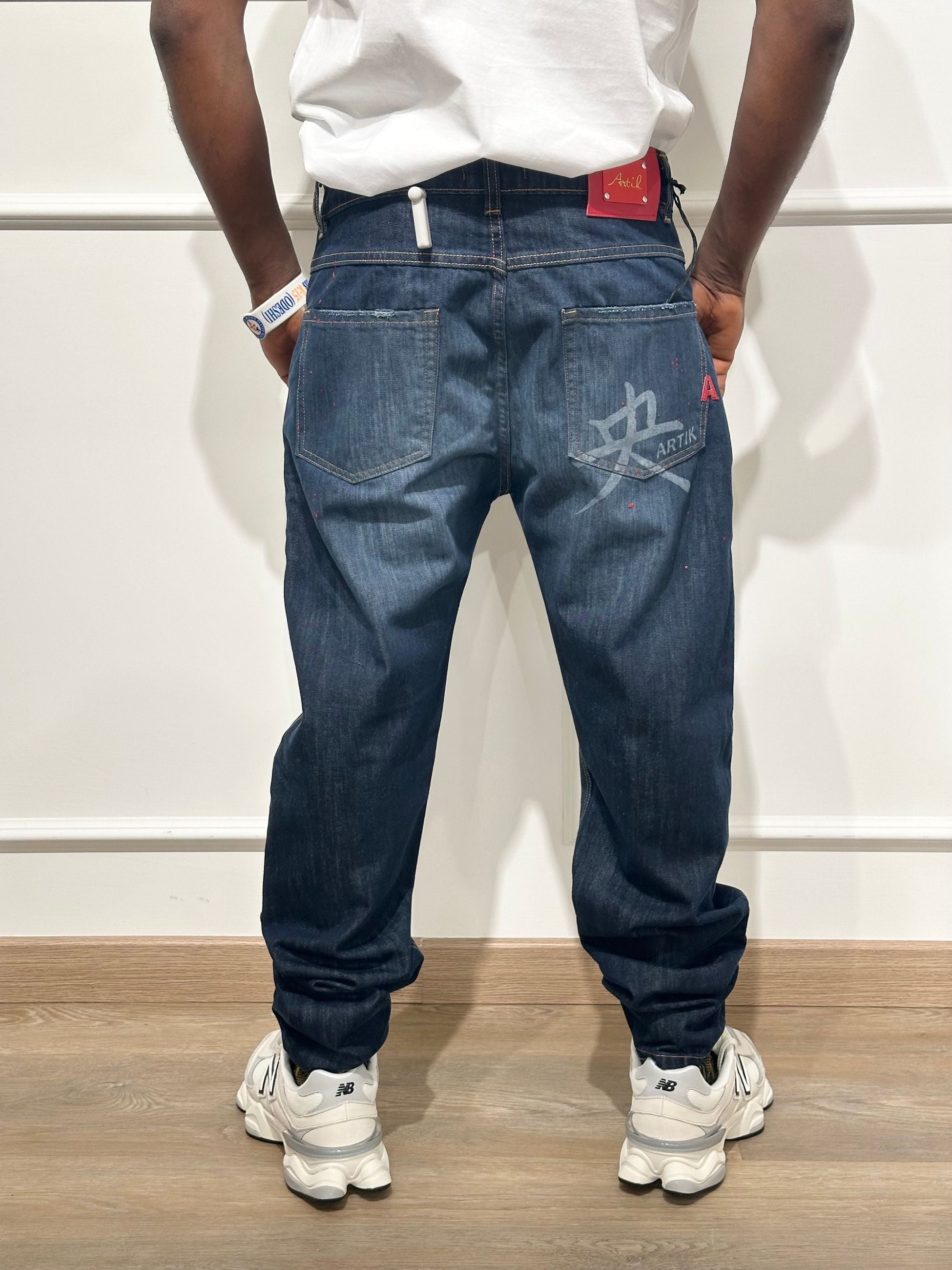 Tutti i jeans ARTIK DENIM presentano diversi lavaggi e finiture, dal denim chiaro con schizzi di vernice a opzioni più scure e slavate.
