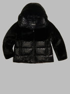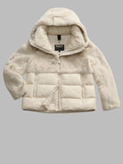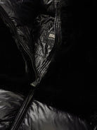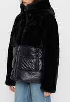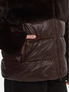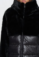 Giubbino donna in ecopelliccia nella parte superiore e in nylon lucido nella parte inferiore. Caldo cappuccio ed impuntura sotto a righe orizzontali; capo pensato per proteggere dagli inverni più rigidi senza rinunciare allo stile.