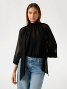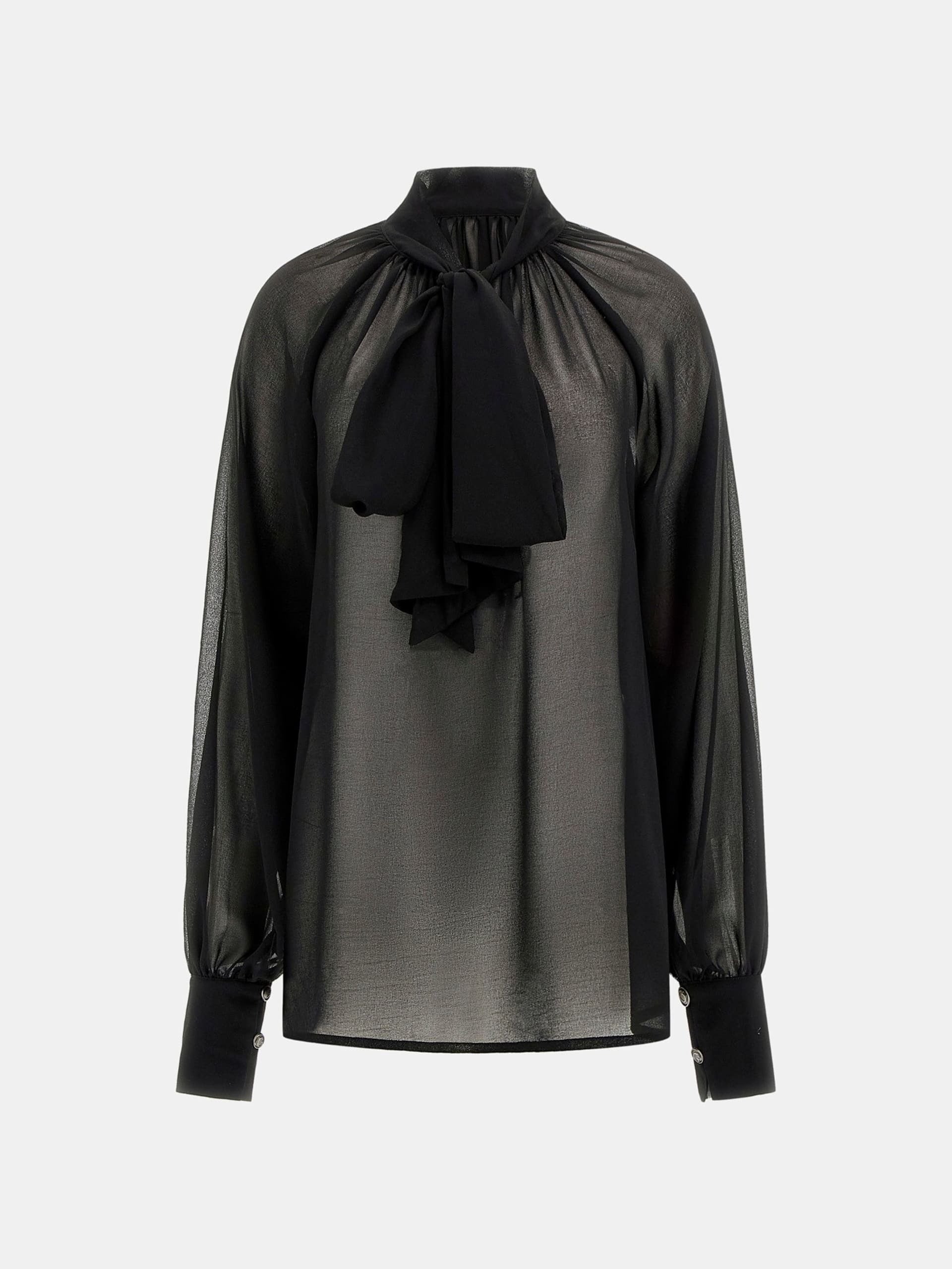Collo a fiocco. Abbraccia l'eleganza senza sforzo con questa blusa in tessuto. Corpo fluido, maniche raglan lunghe e collo a fiocco, perfetta per serate sofisticate. Questo capo è prodotto con componenti riciclati.