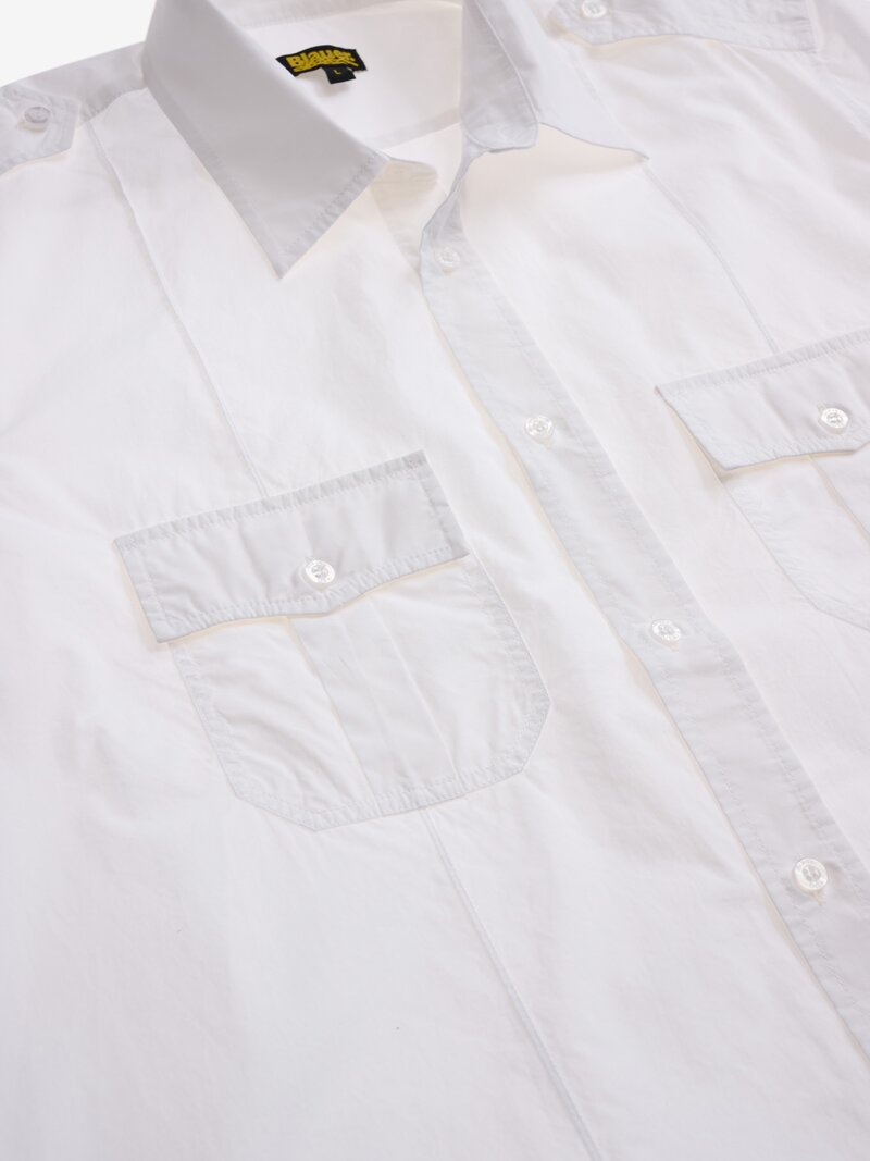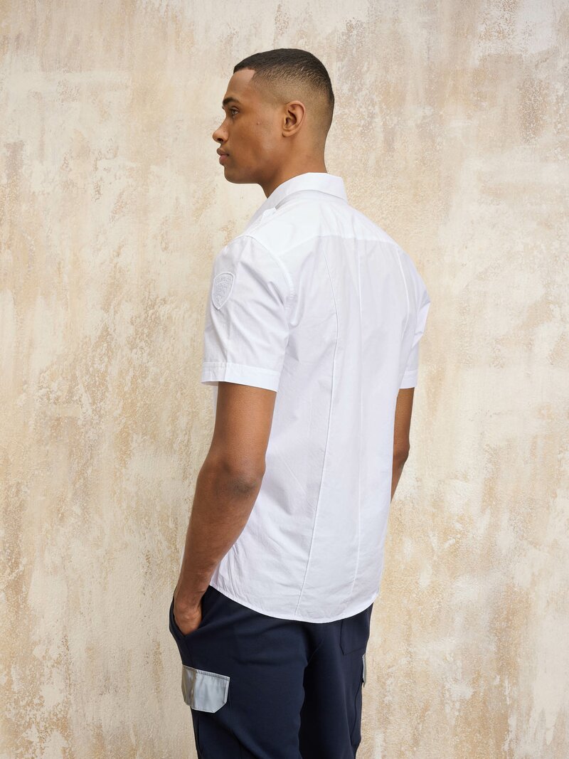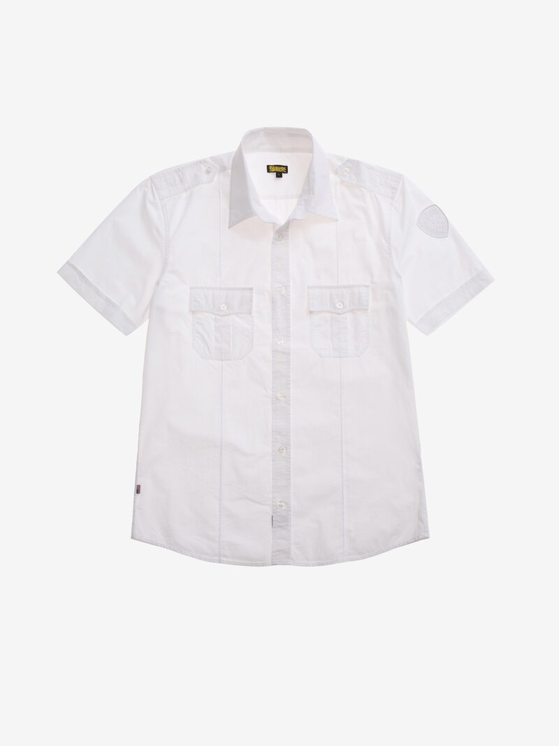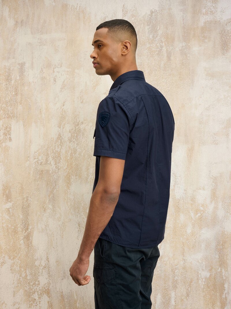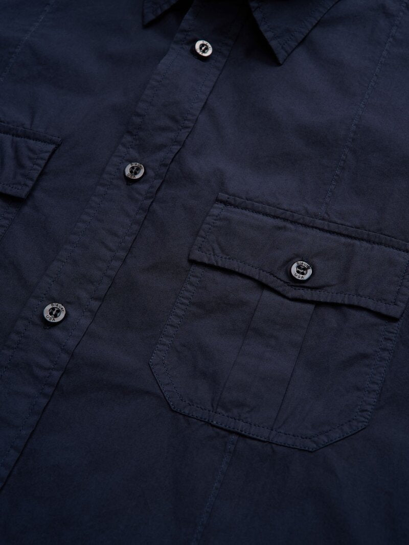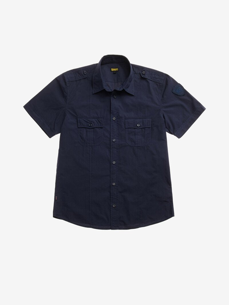 Camicia uomo monocolore dallo style militare e fondo stondato. Due tasche sul petto con pattina e bottone al centro.