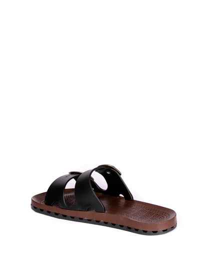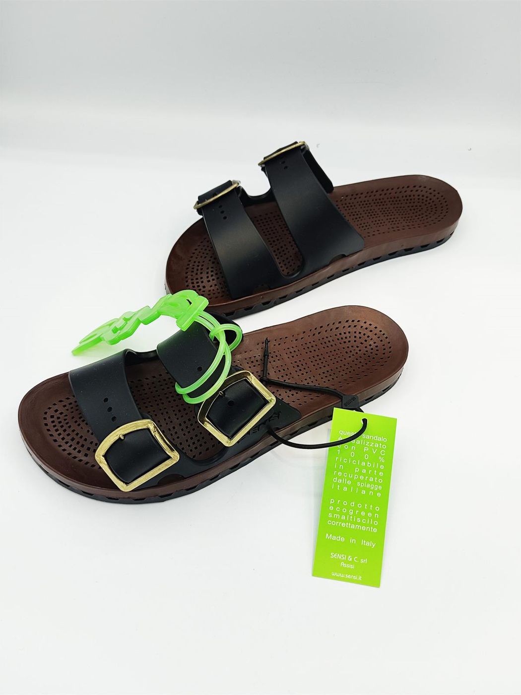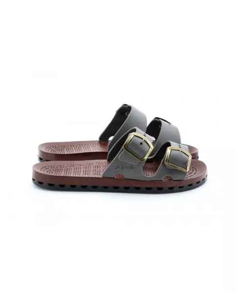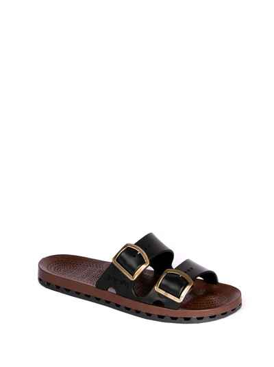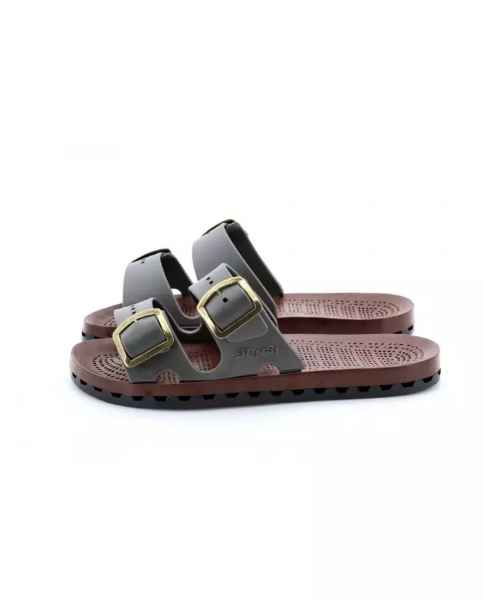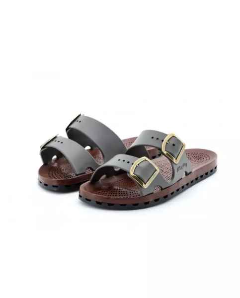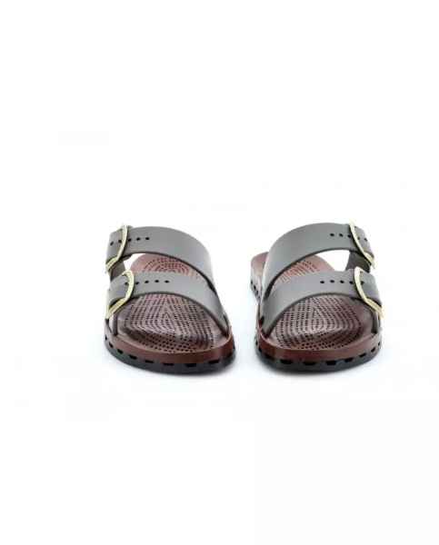Ciabatte uomo con doppia fibbia con la speciale suola in PVC ottenuta dall'accoppiamento meccanico di un sottopiede traforato, ad un fondo con canali di deflusso che consentono lo scarico dell'acqua verso l'esterno. Viceversa la pressione esercitata ad ogni passo dal piede sul sottopiede crea una ventilazione che lo mantiene così costantemente asciutto.