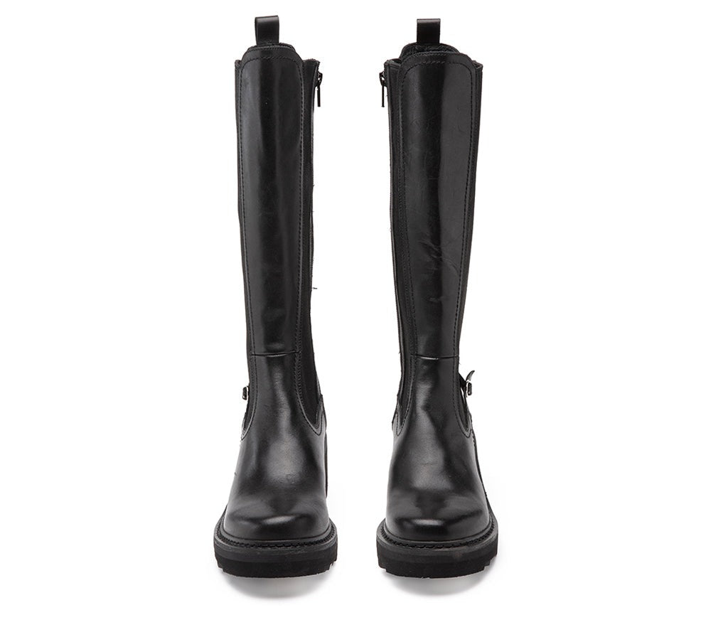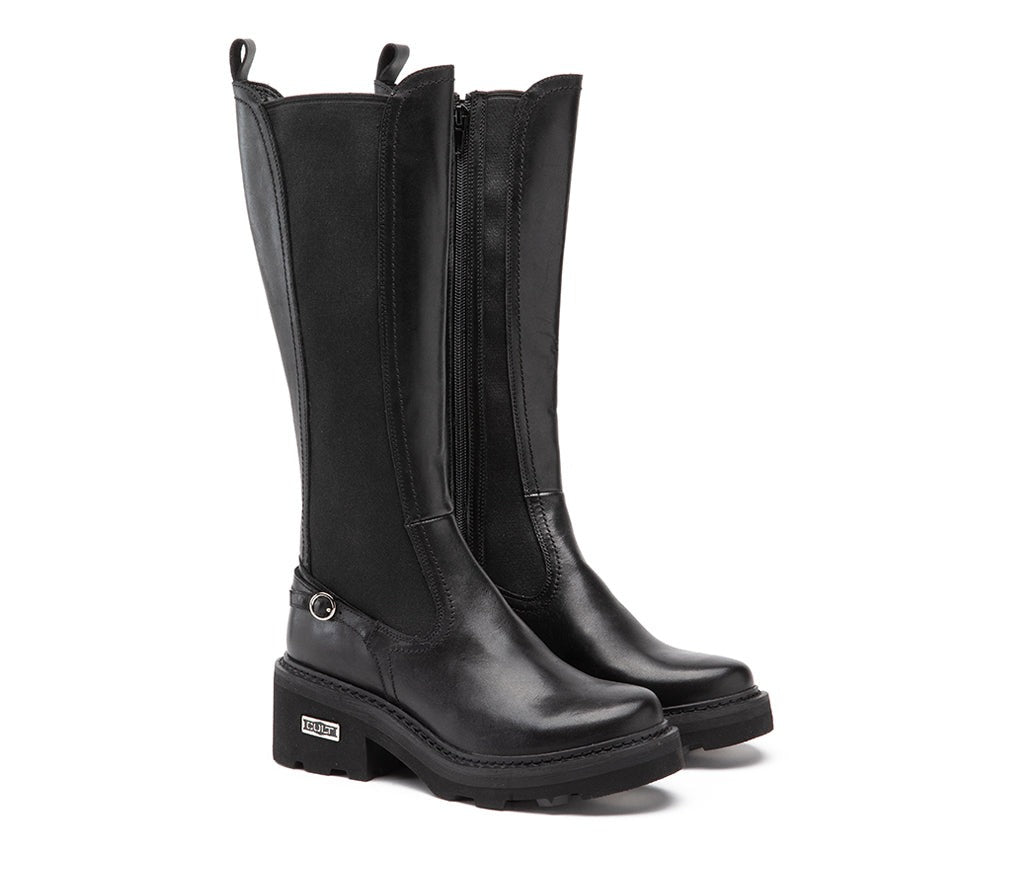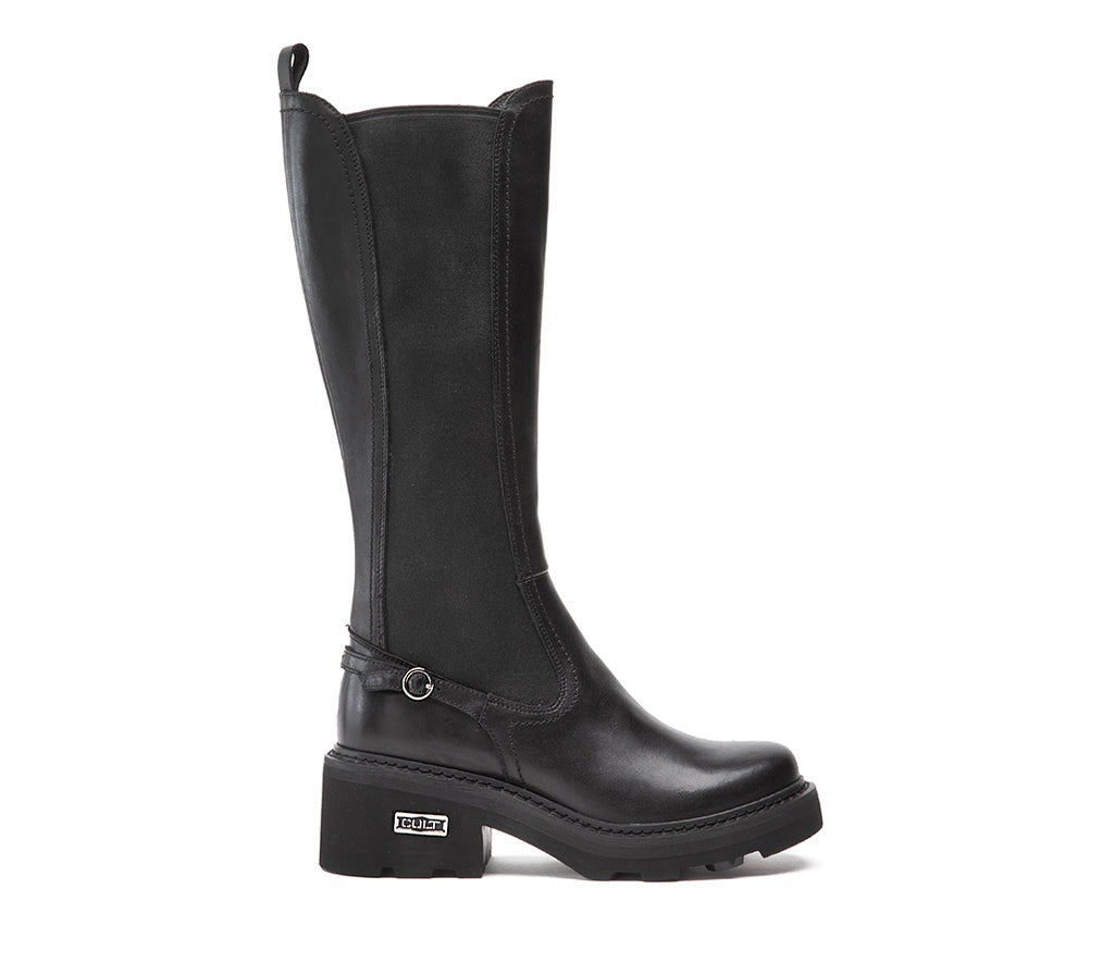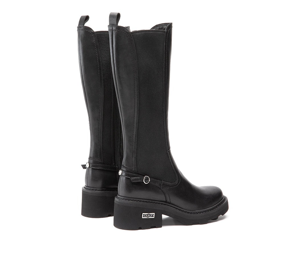 Stivale donna Eleganza ribelle con anima fashion per questo stivale firmato CULT. E' caratterizzato da una costruzione robusta, perfetta per un’attitude urban-chic: tomaia in pelle nera, suola zigrinata e tacco chunky per affrontare la città con stile. Il cinturino decorativo con fibbia argentata rotonda e la placca metallica CULT sul tallone aggiungono grinta e riconoscibilità al design. Ideale per look edgy e per chi ama distinguersi. Altezza tacco 5 cm.
