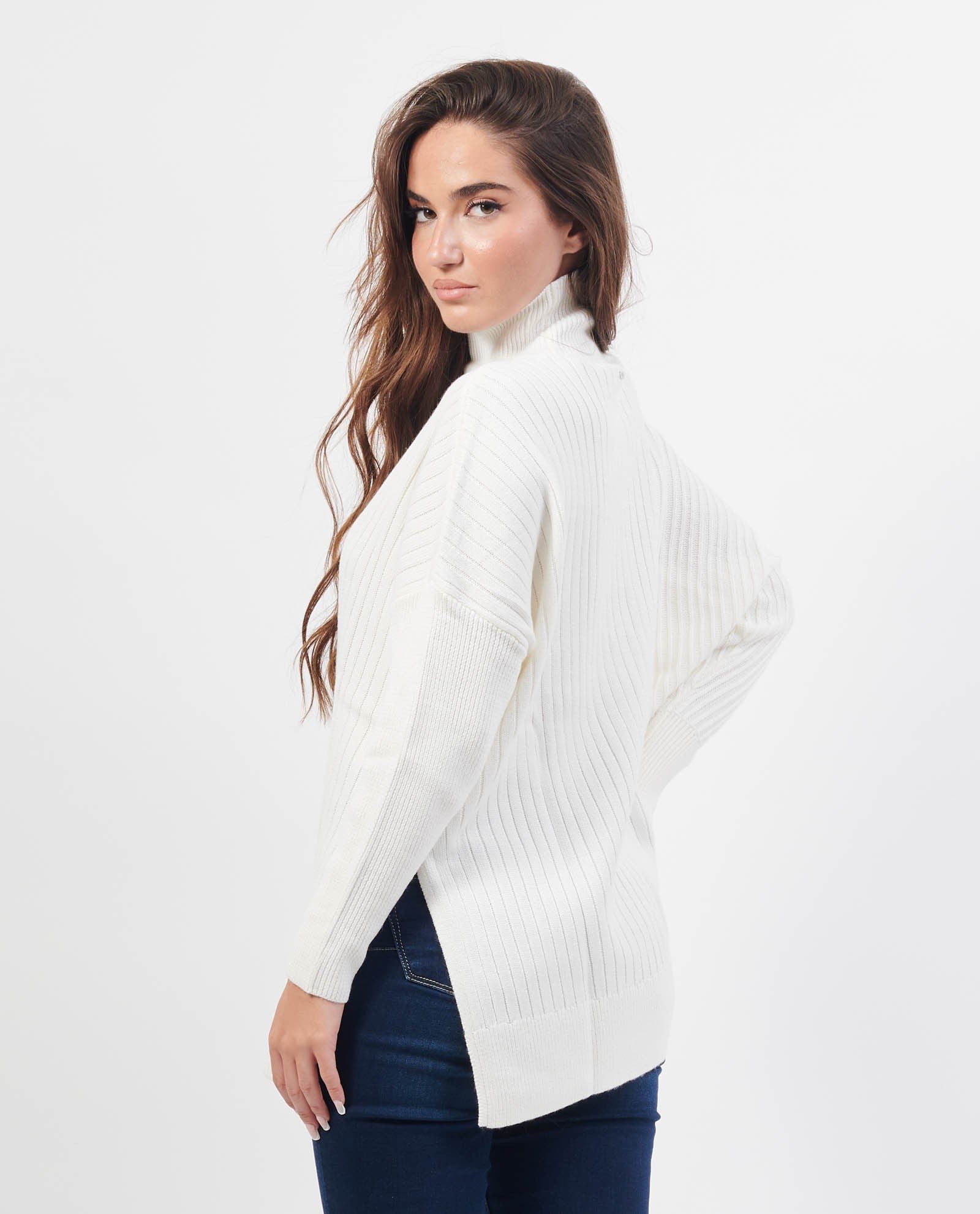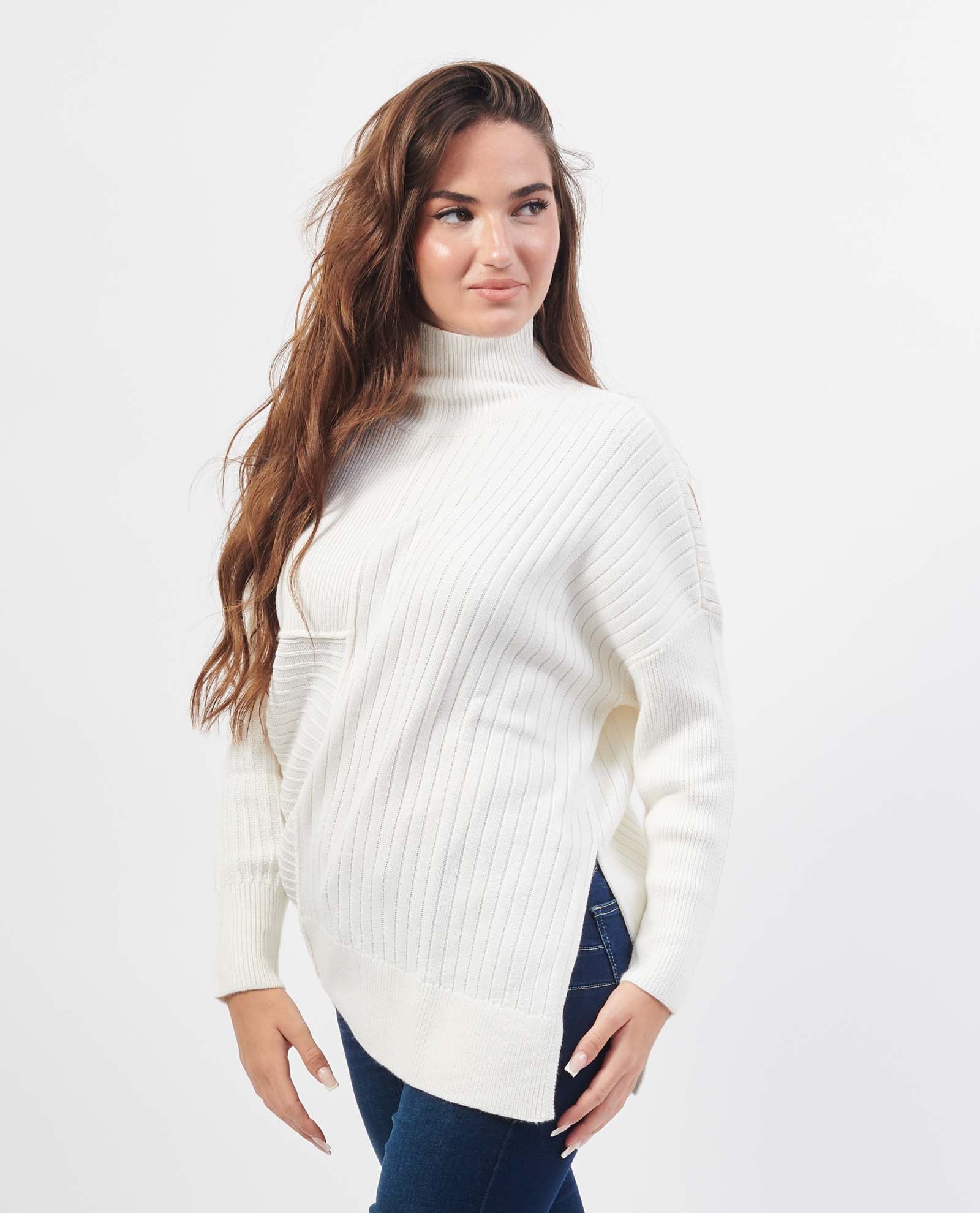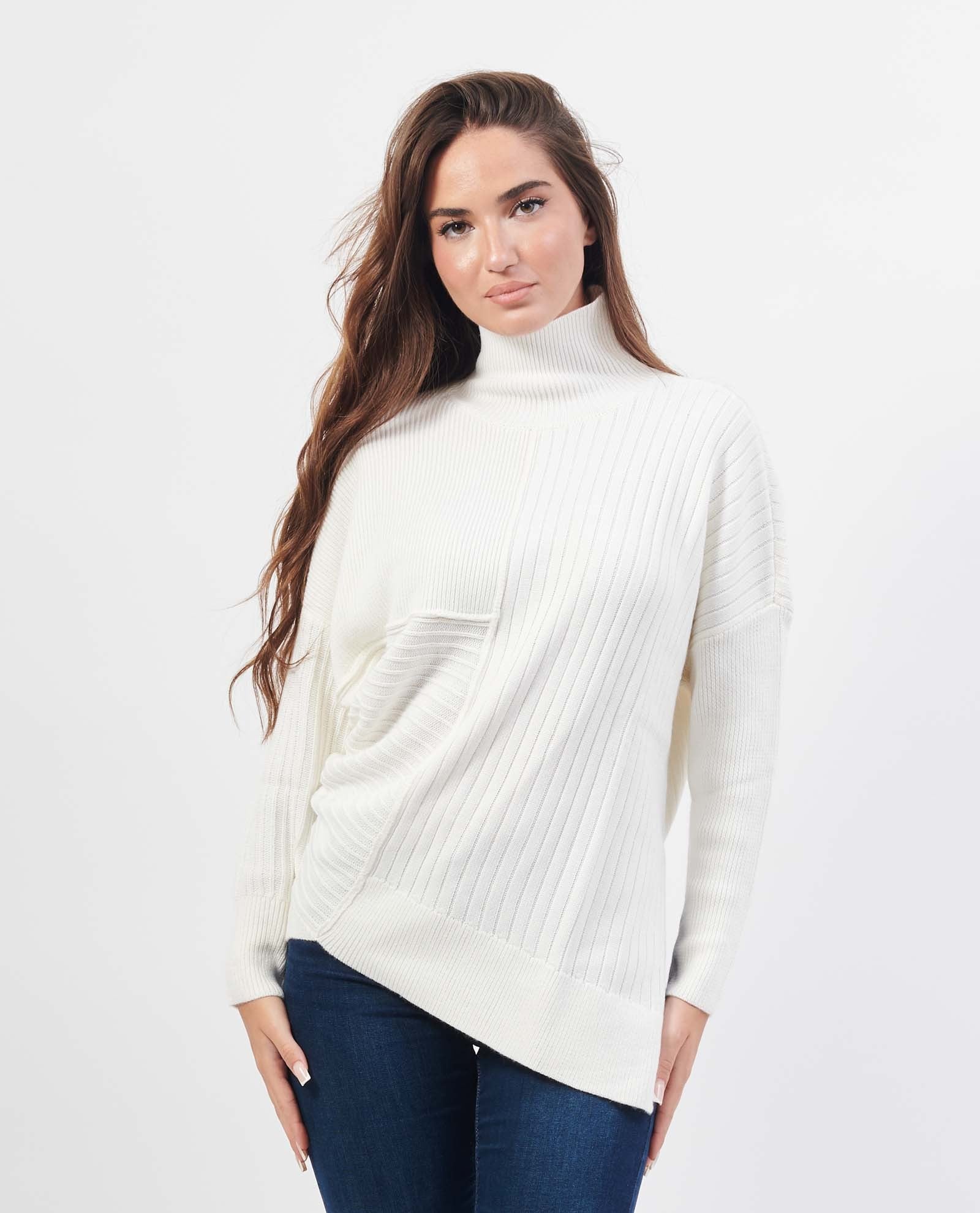 Pullover in maglia a collo alto con design asimmetrico. Il design presenta comode spalle scese e toppe di costine di diverso spessore. L'orlo asimmetrico presenta anche uno spacco laterale, rendendolo un capo ricco di design. Questo vestito è facile da abbinare anche a jeans e gonne.