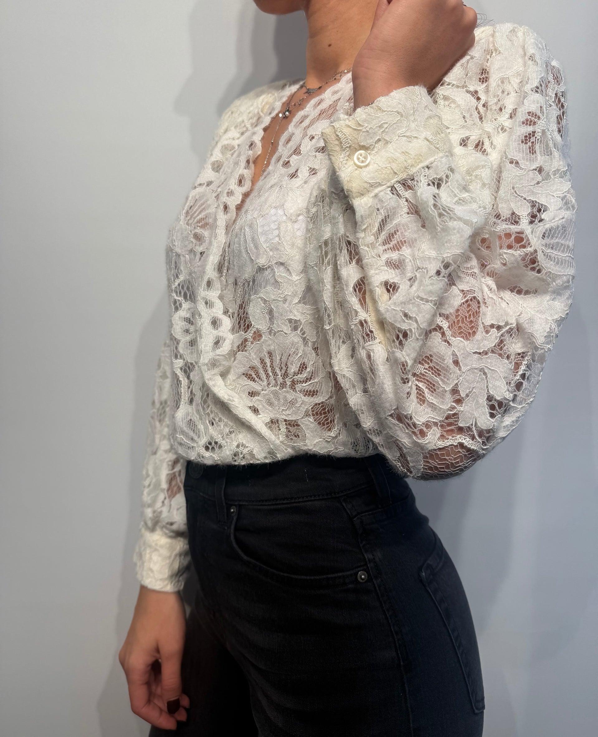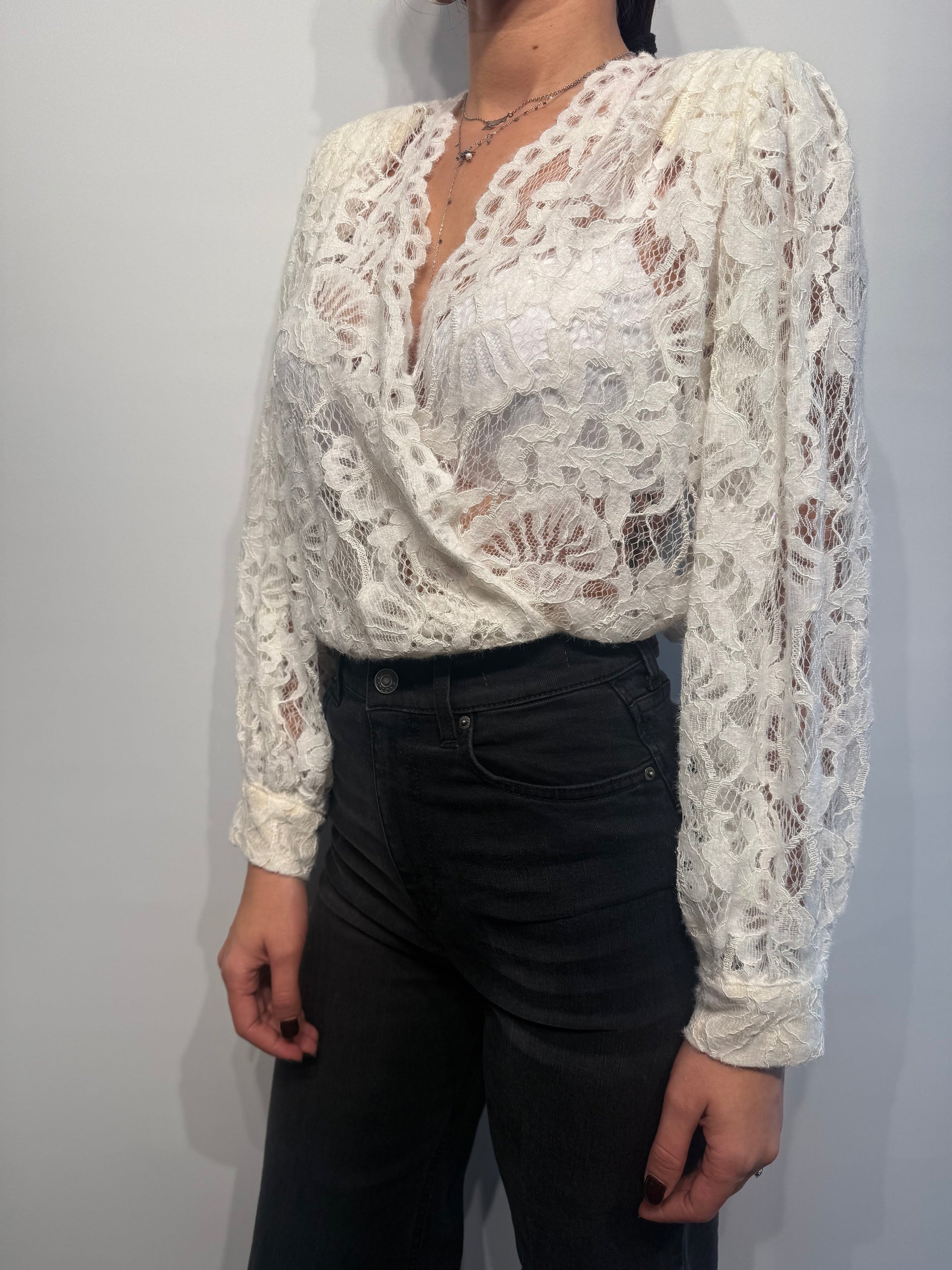 Body in pizzo e velluto con incrocio sul seno e manica lunga culotte in lycra.