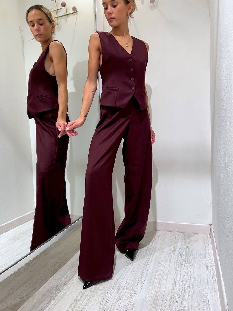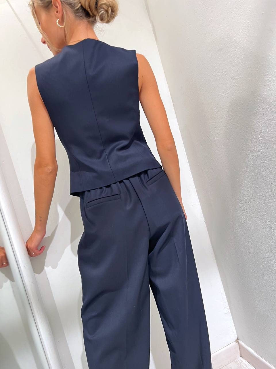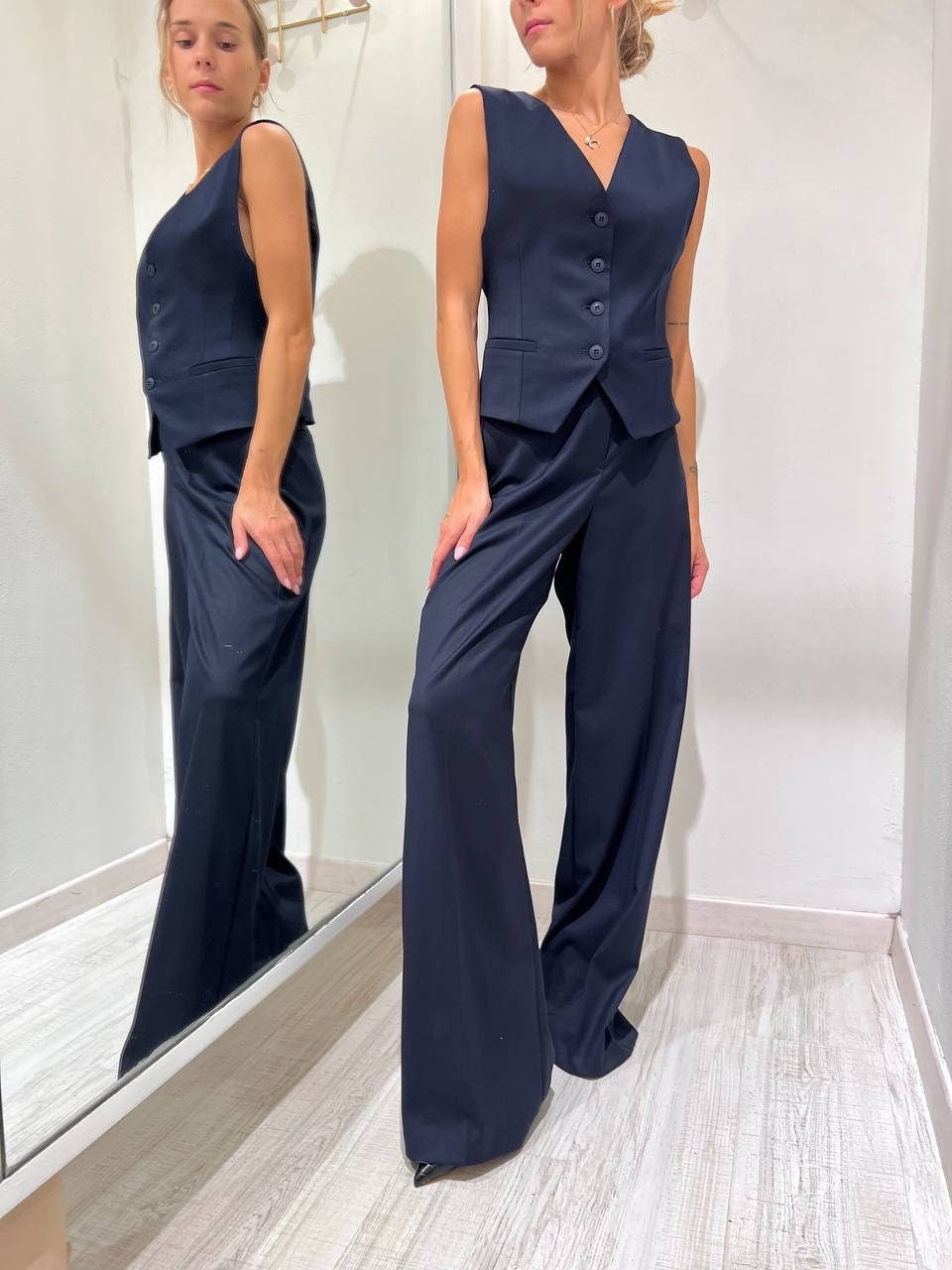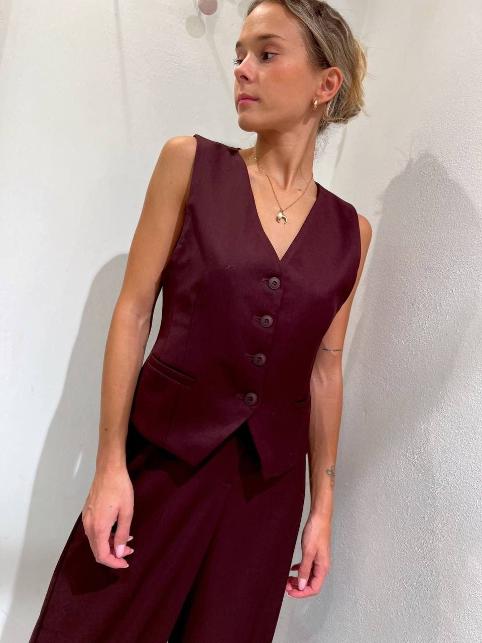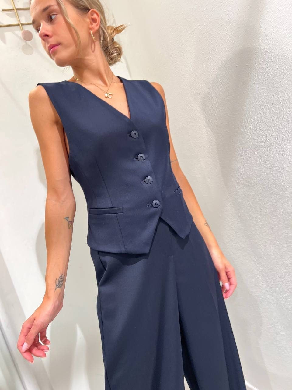 Gilet donna in viscosa, modello spalla larga, con chiusura quattro bottoni frontali in tono e scollo a V. Finte tasche a filetto laterali. Vestibilità regolare.