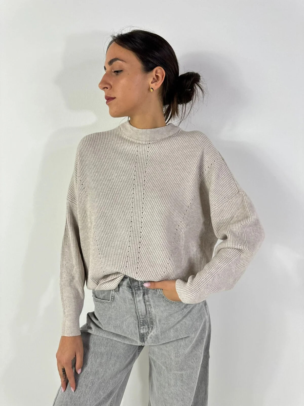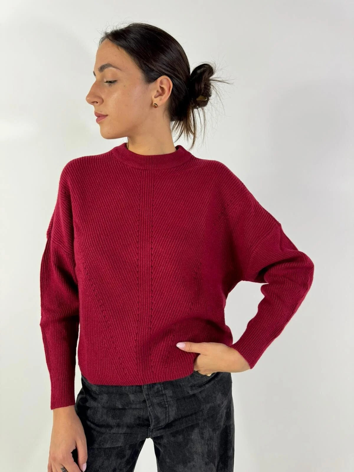 Maglia donna modello girocollo alto con maniche lunghe modello ampio con motivi trasversali