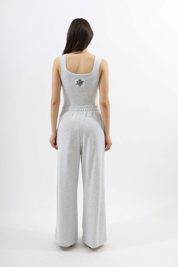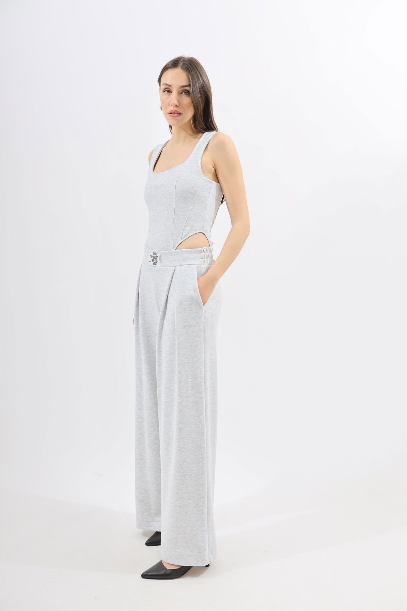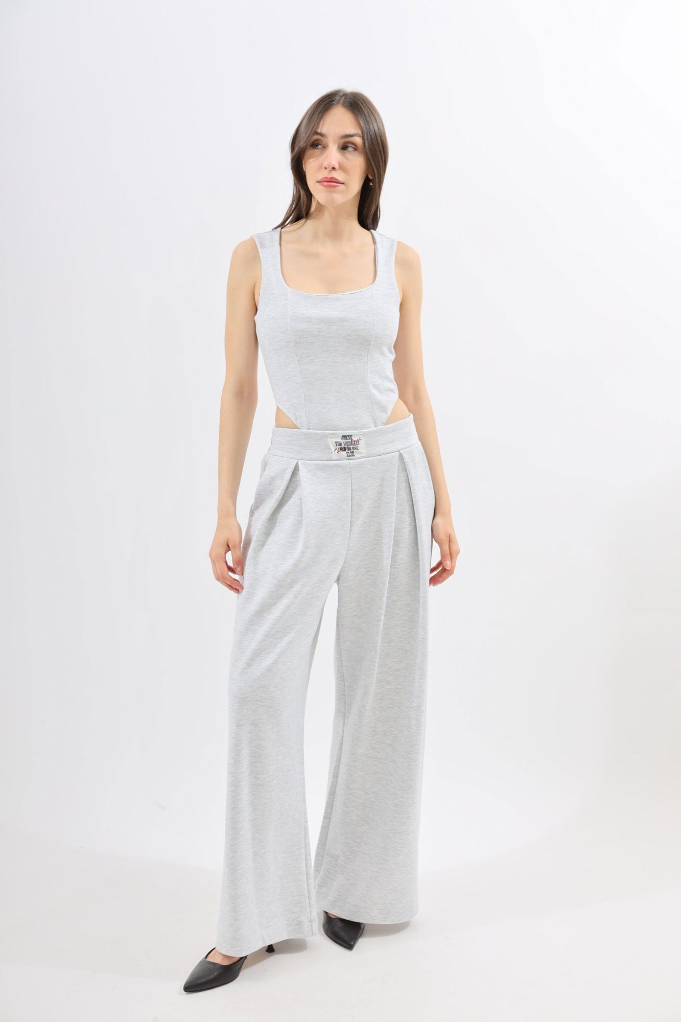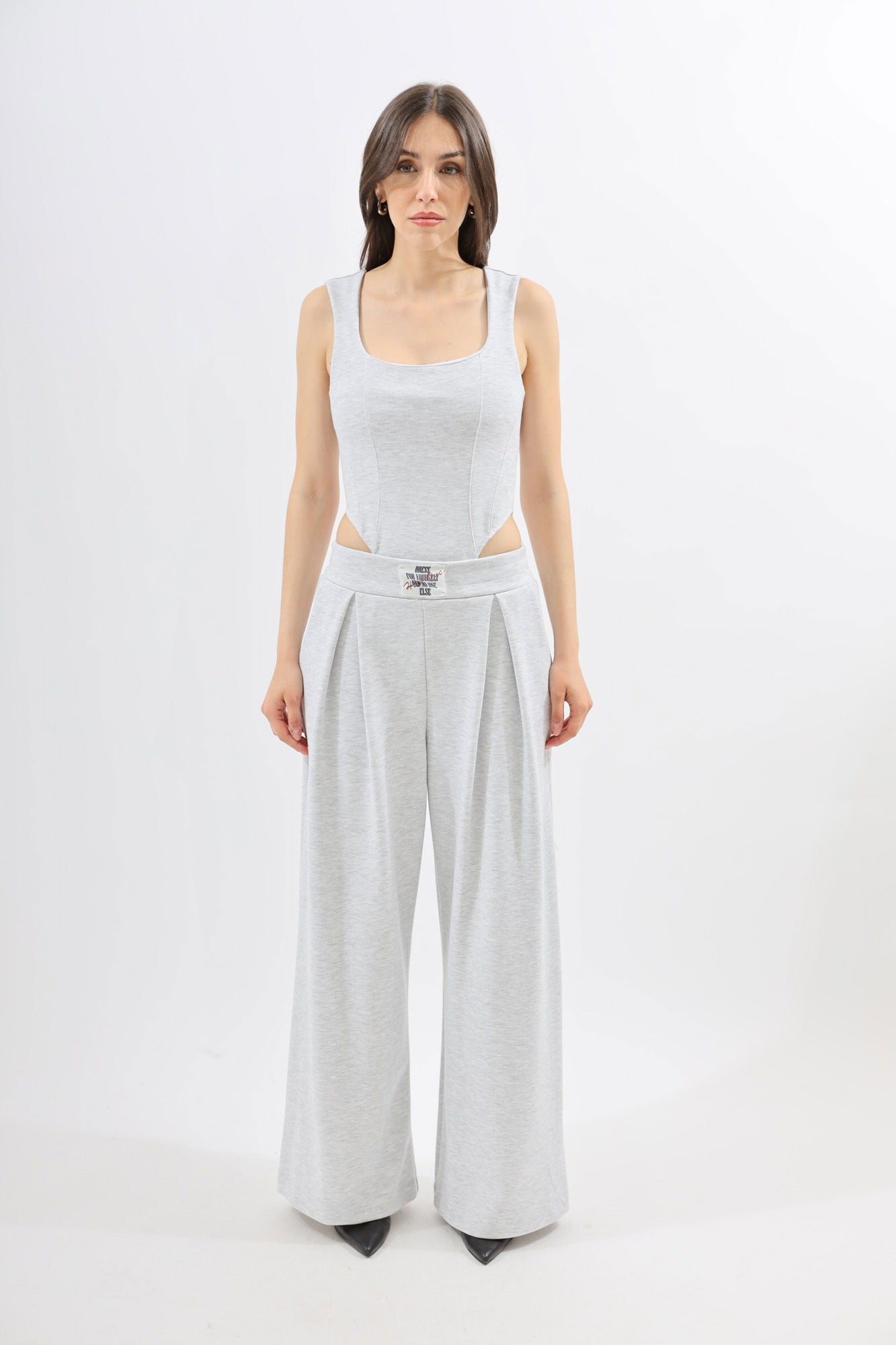 Pantalone donna in cotone garzato grigio melange con grandi pinces. Modello ampio con tasche laterali bustino in vita