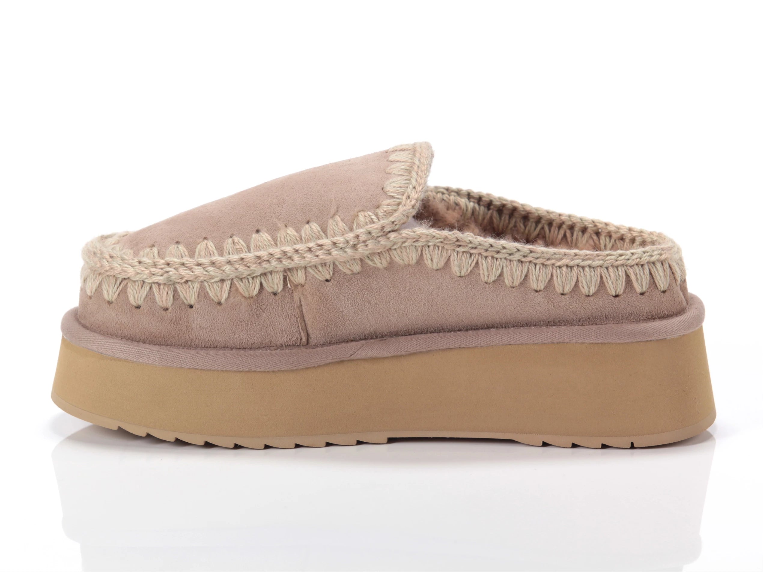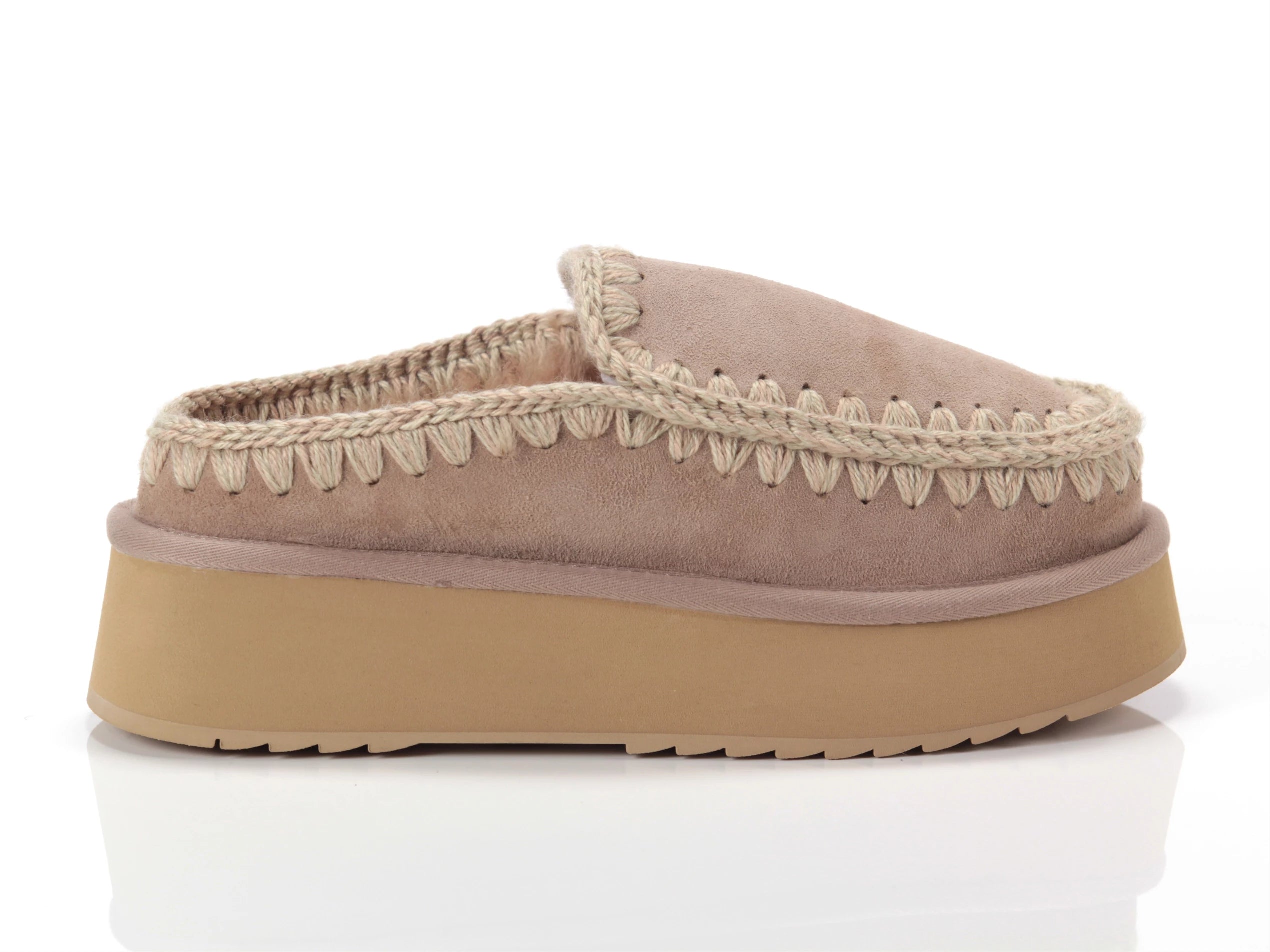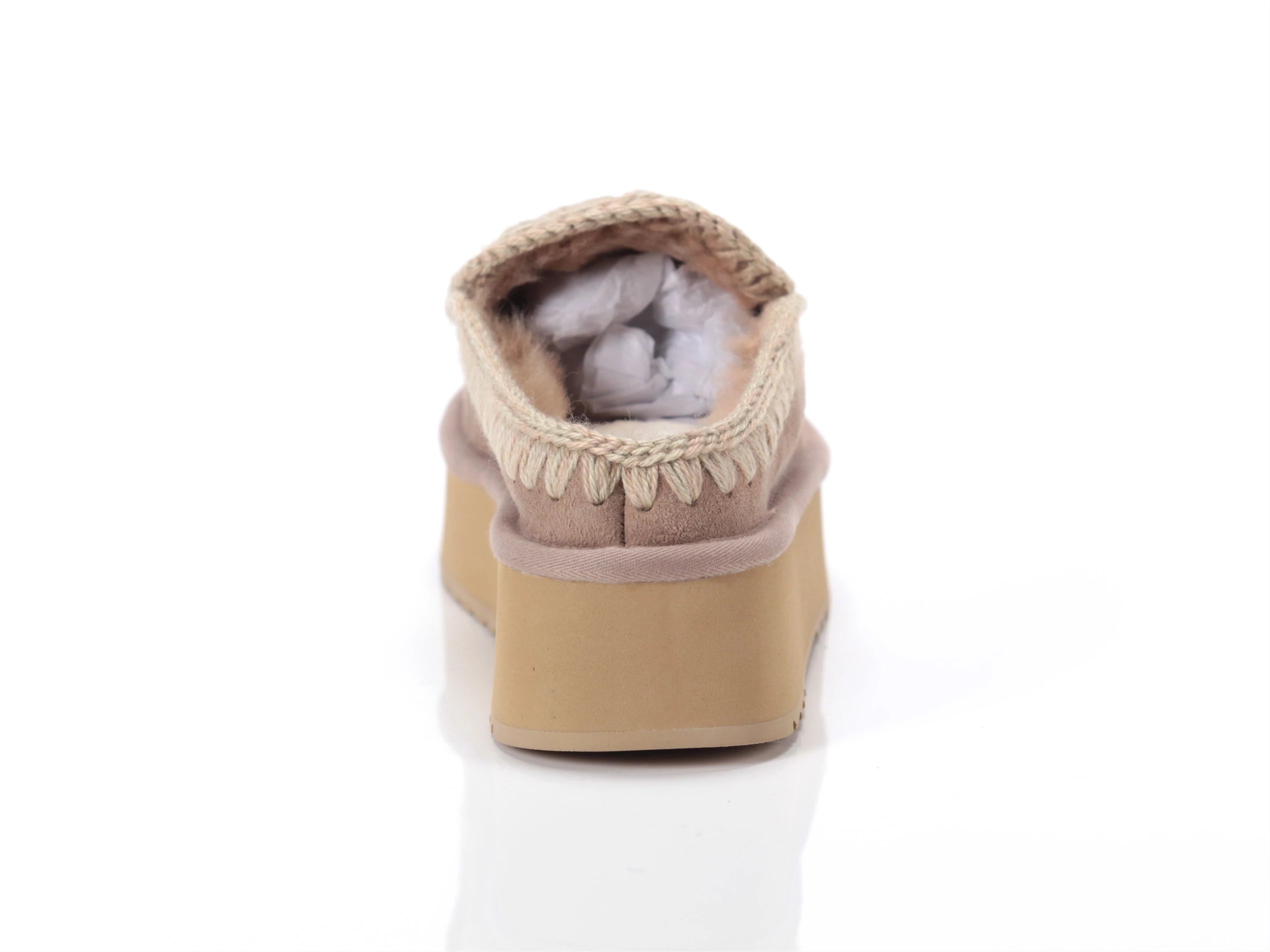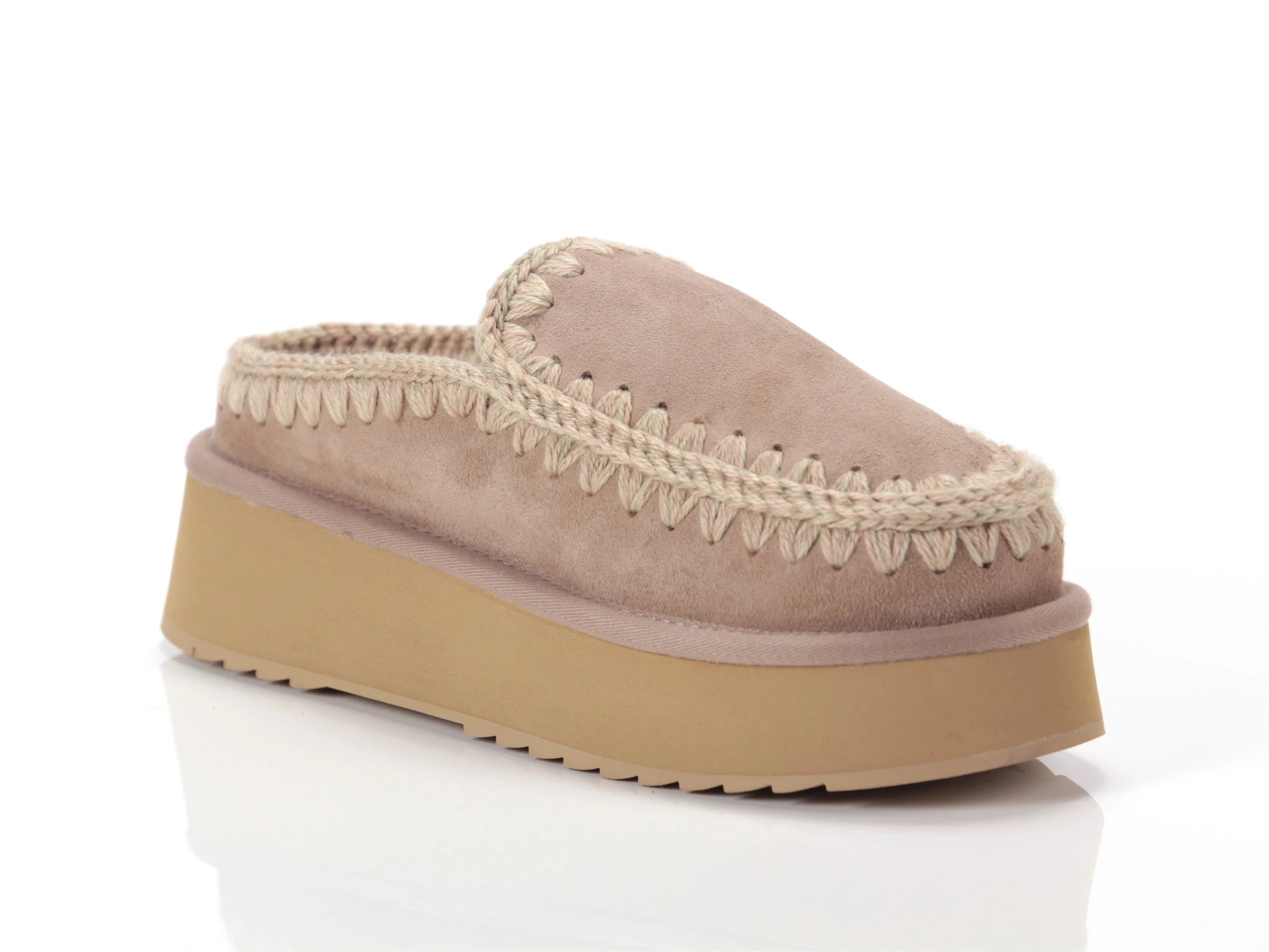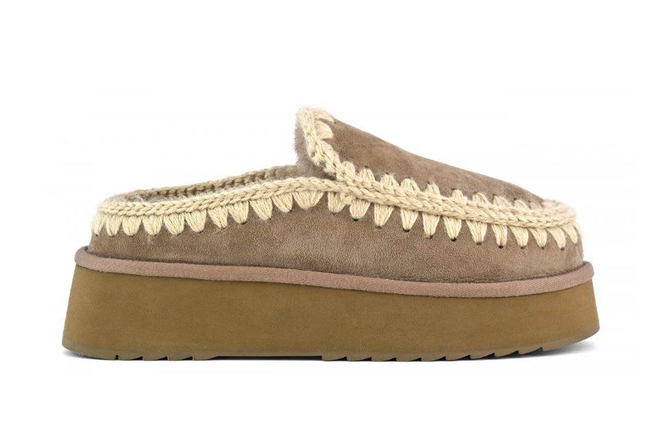 Novità per l'autunno-inverno 2024: il comodissimo clog eskimo slip-on platform è sapientemente realizzato a mano con lussuoso camoscio e presenta le cuciture in lana all'uncinetto distintive di mou. Incredibilmente confortevole e resistente con suola in gomma EVA. Altezza 18 cm.