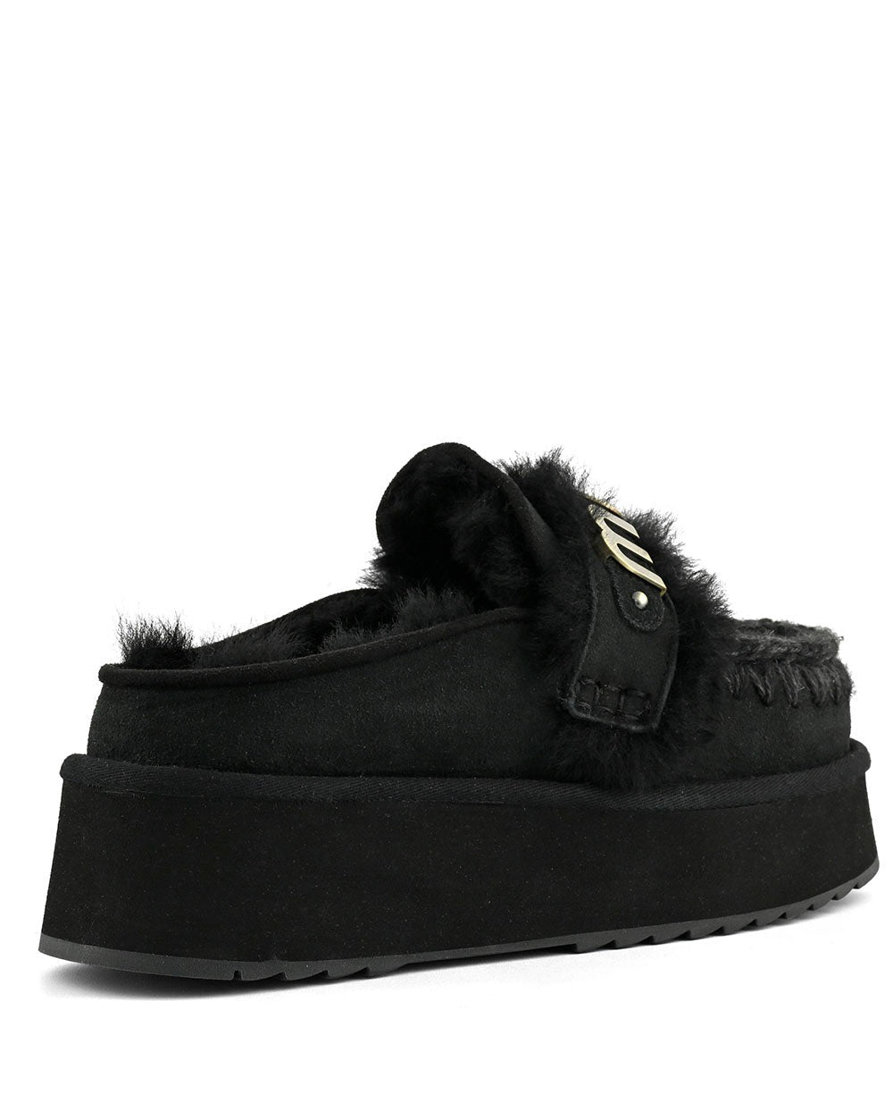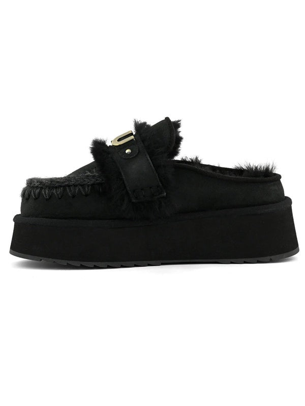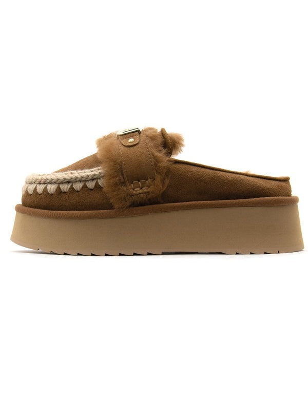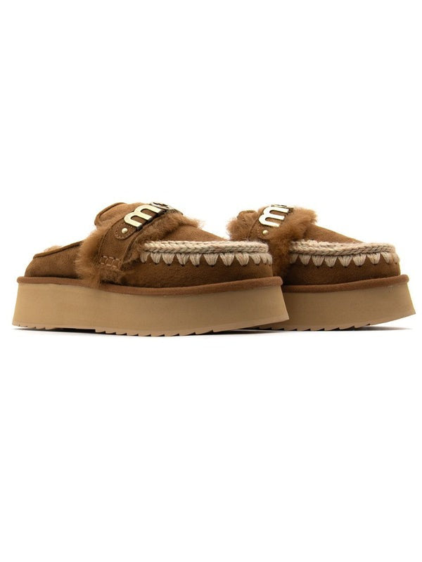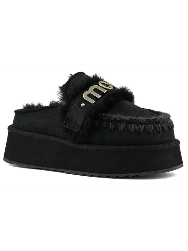 Ciabatta donna il platform clog with logo strap di mou è sapientemente realizzato a mano in vero montone double-face e arricchito dagli inconfondibili dettagli in lana all'uncinetto firmati mou. Incredibilmente confortevole e resistente con suola in gomma EVA. Altezza: 4 cm.