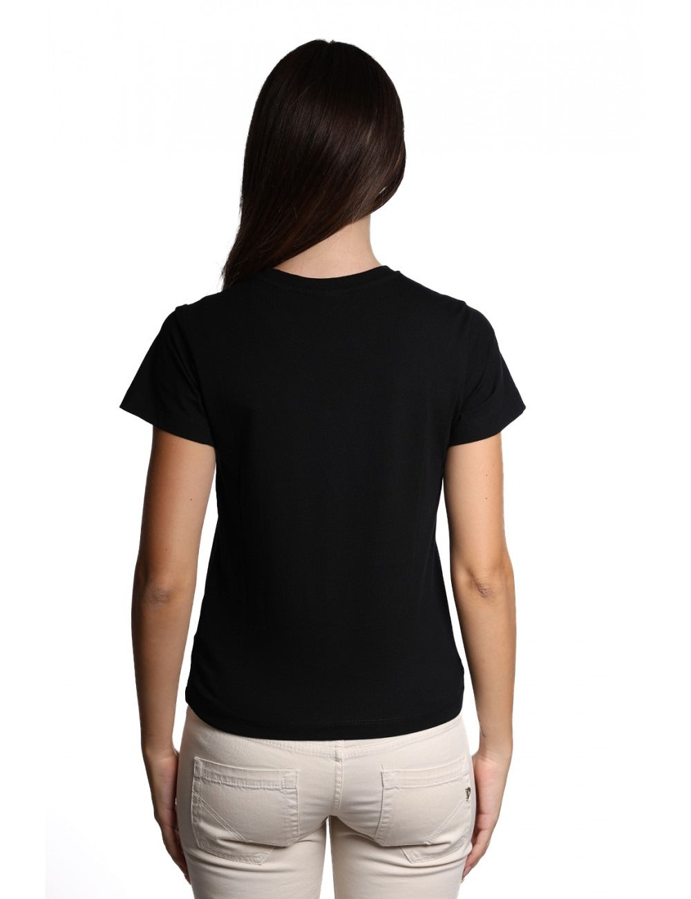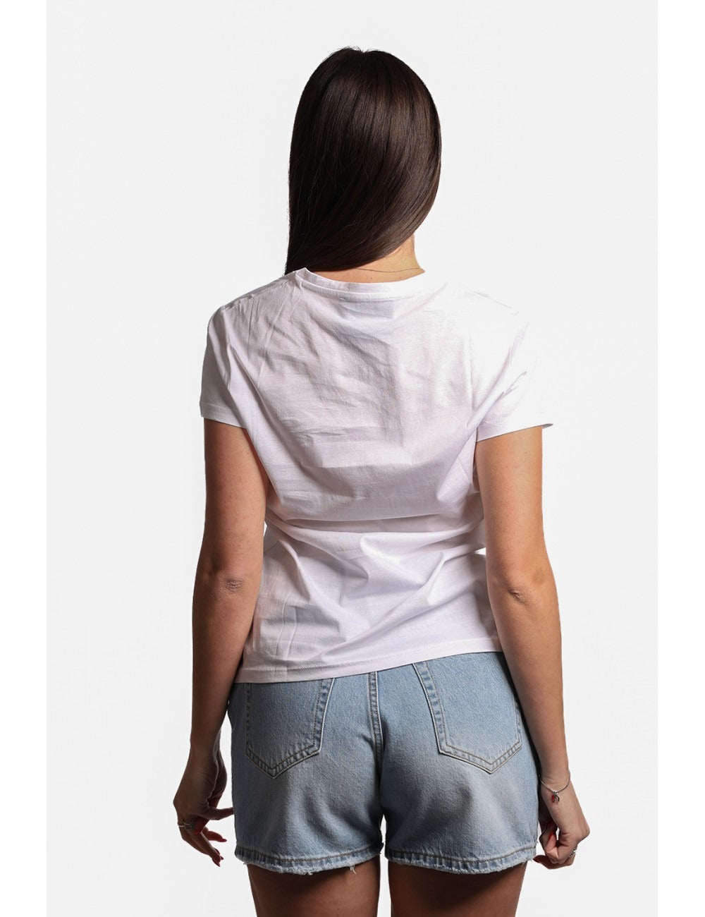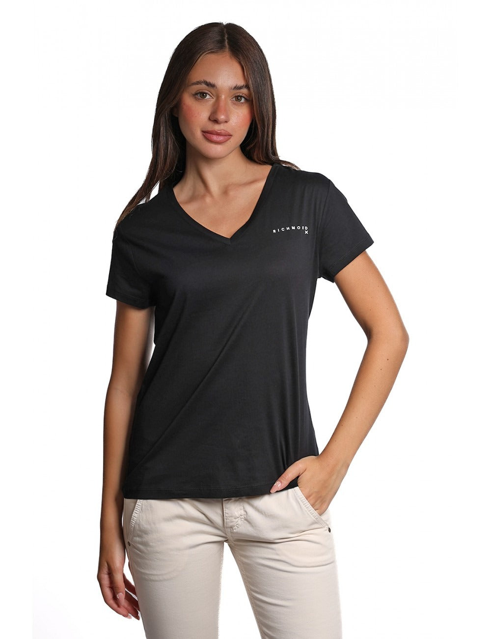 T-shirt donna niurka modello basico con maniche corte scollo a vV sritta del logo sul petto