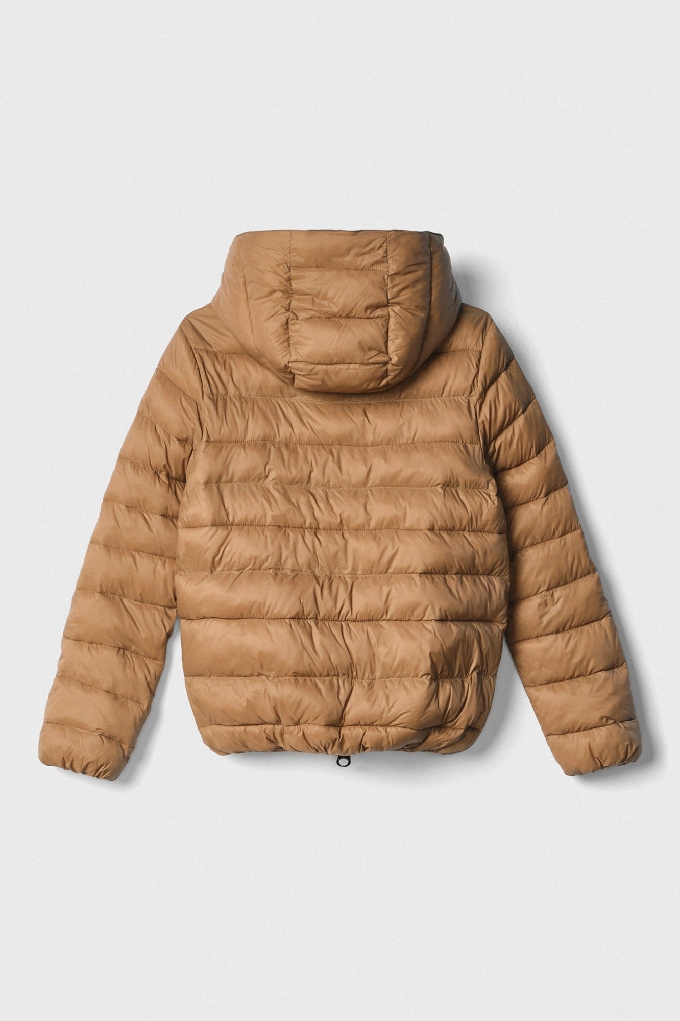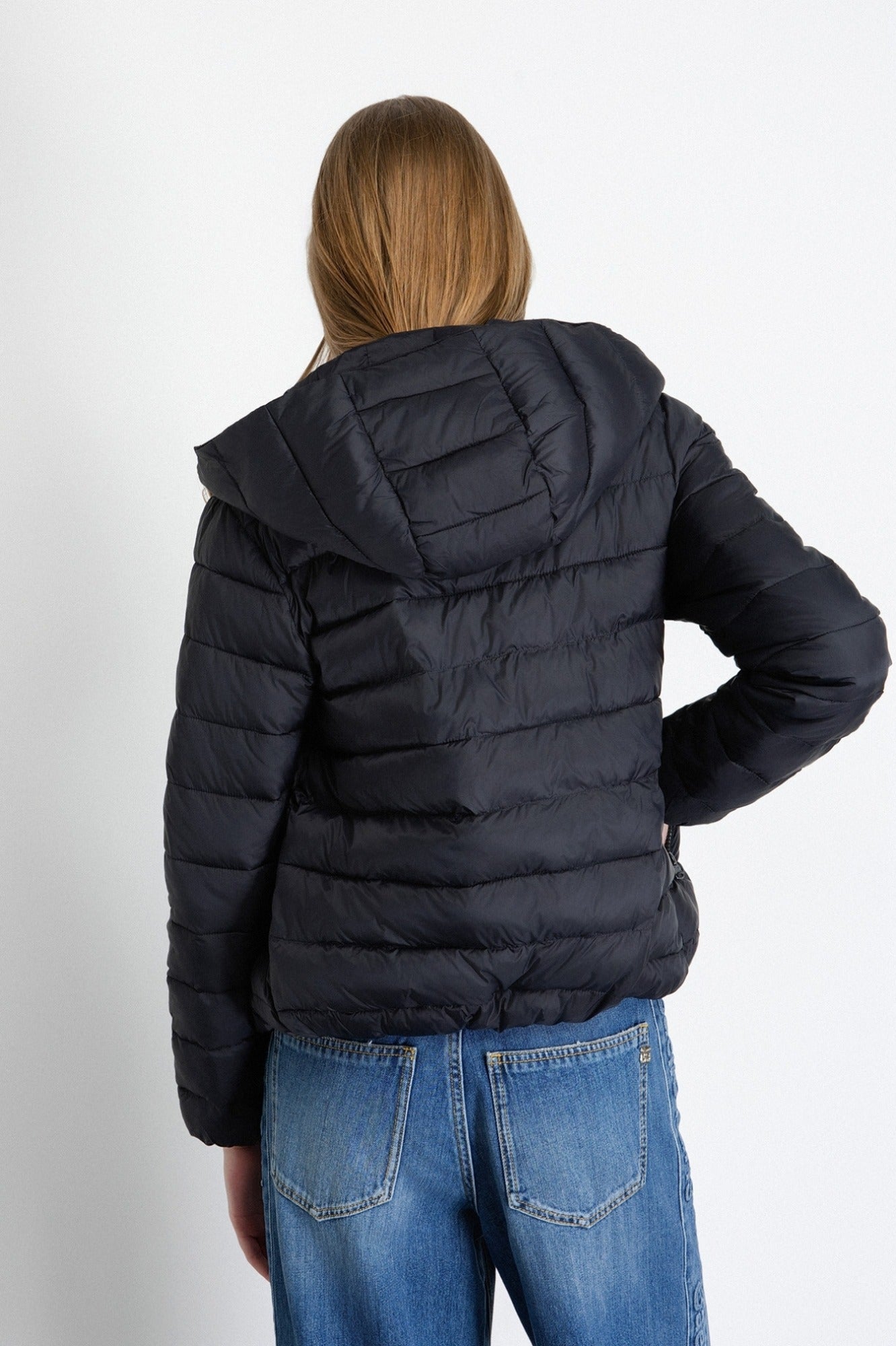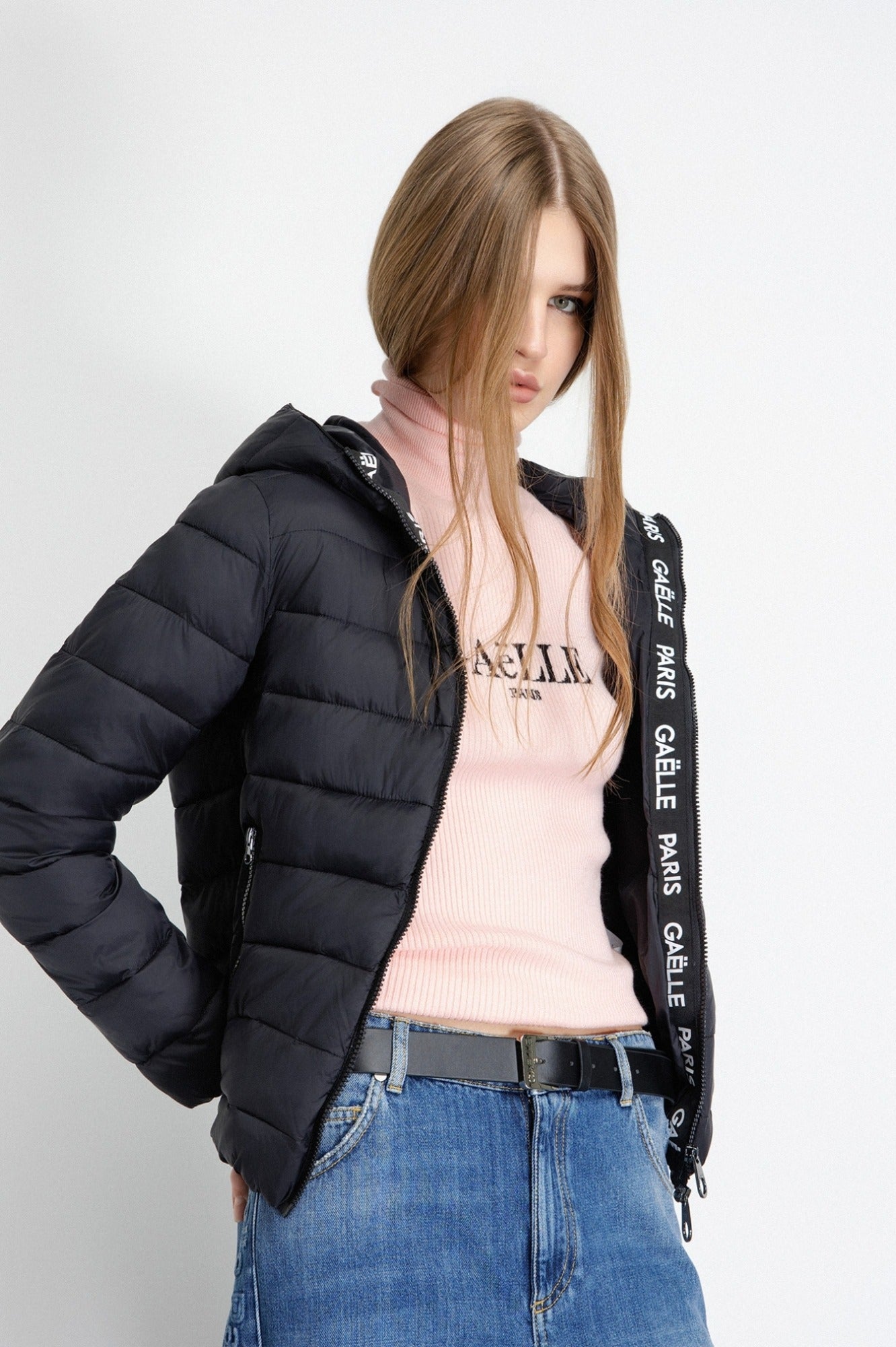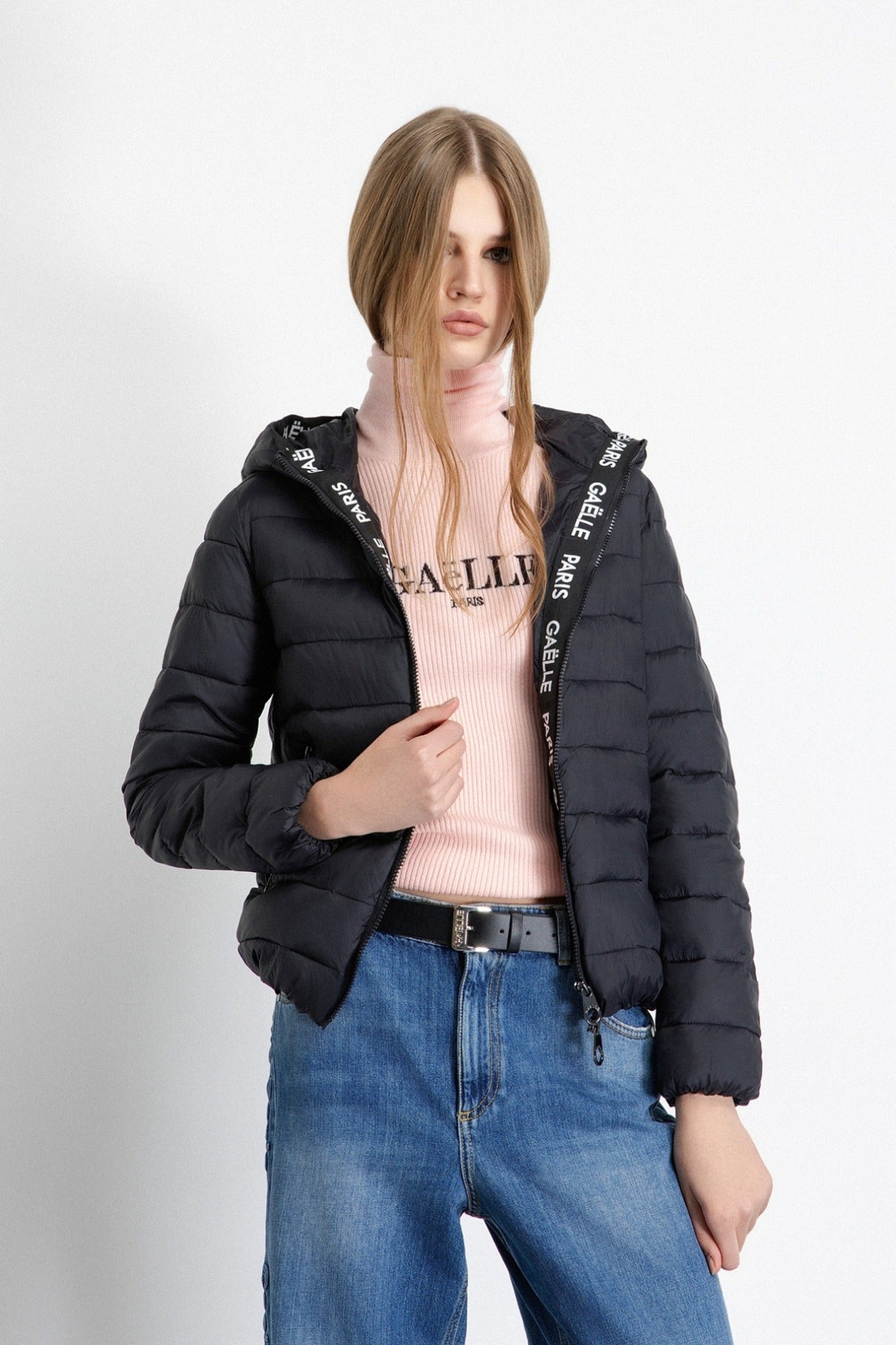 Piumino donna manica lunga con cappuccio e banda scritta marchio interno al piumino, tasche laterali con cerniere chiusura con cerniera