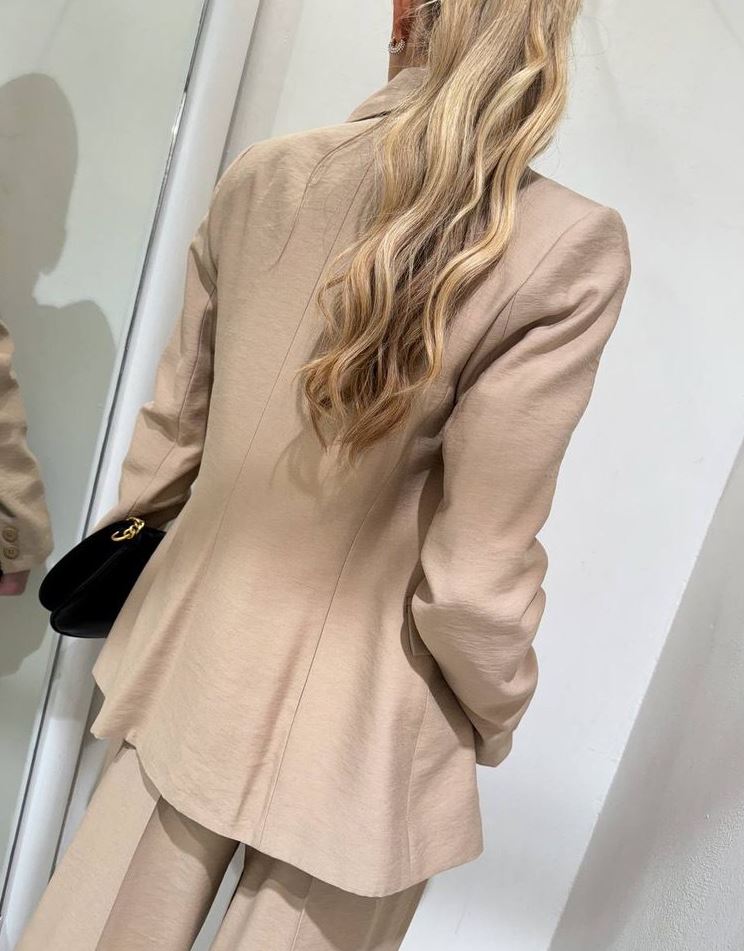 Blazer color beige nocciola in viscosa, modello con chiusura doppiopetto con bottoni in tono, maniche lunghe, collo a revers e tasche laterali con patta. Vestibilità regolare.