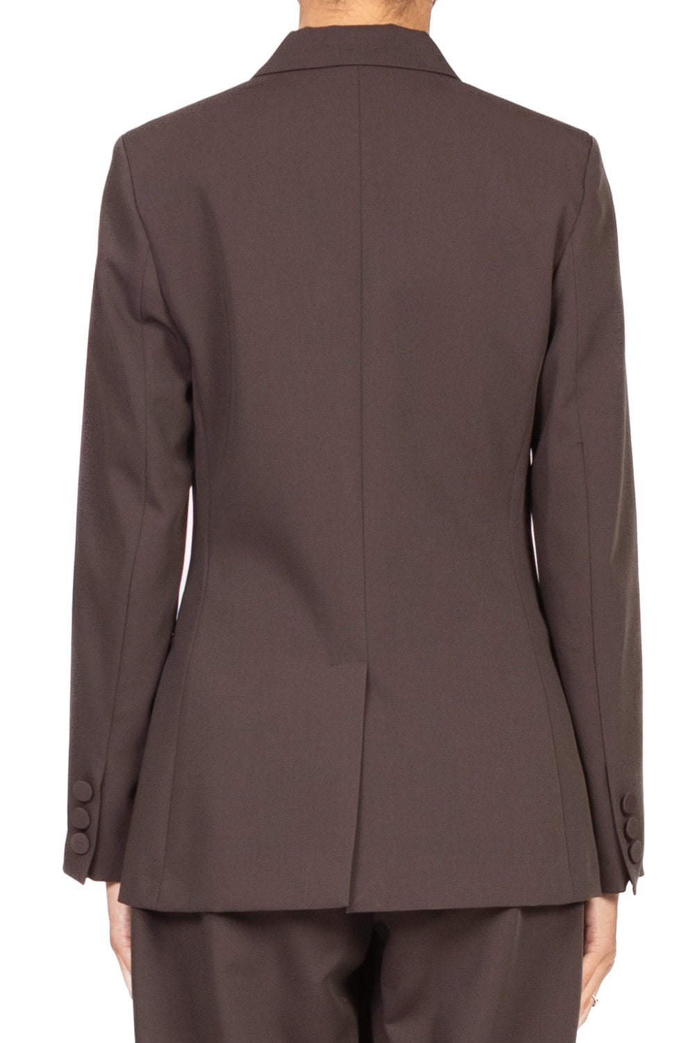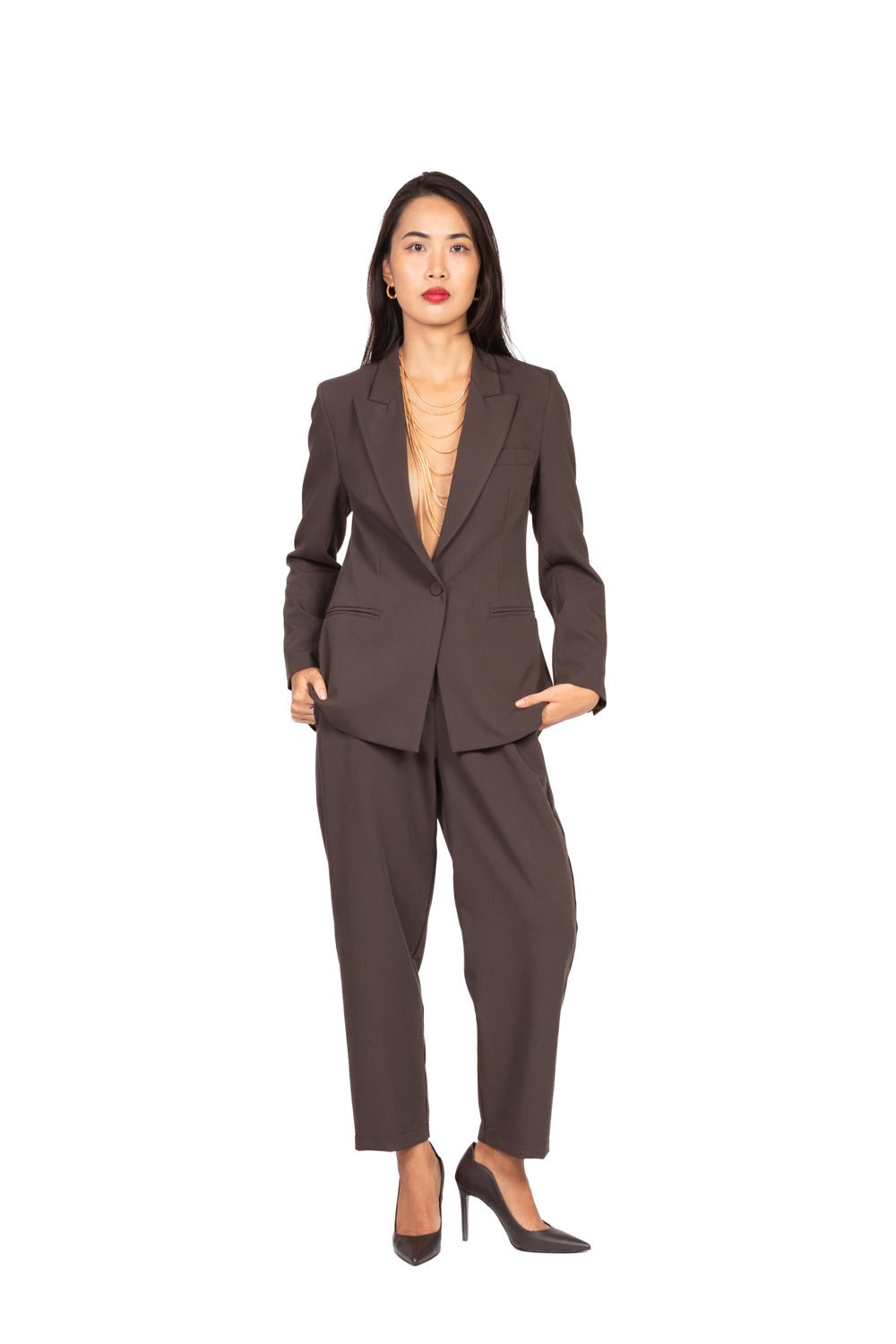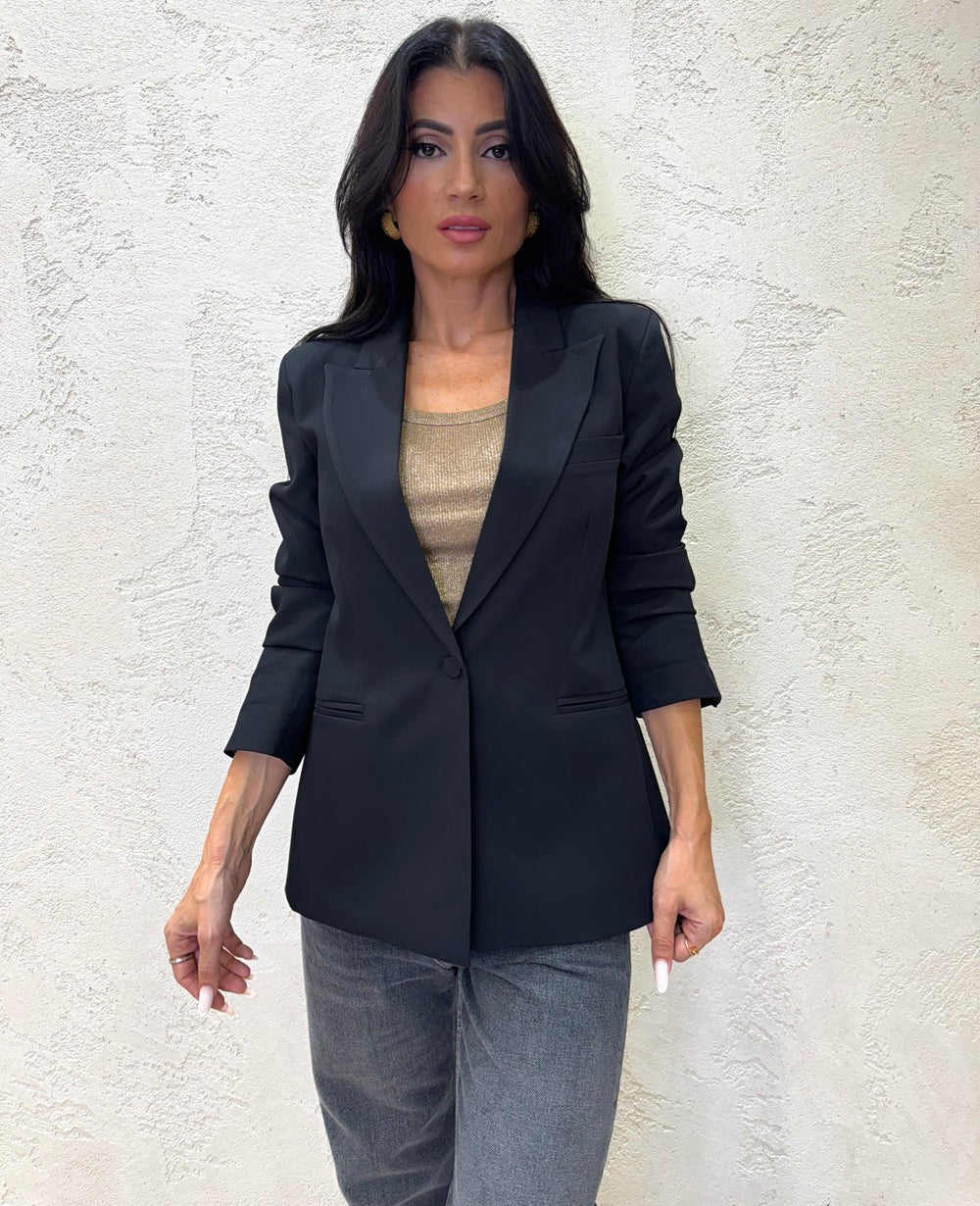Giacca un petto caratterizzata da un bottone rivestito in tessuto che aggiunge un tocco di raffinatezza al design classico. Completamente foderata, garantisce comfort e una vestibilità ottimale. I taschini discreti e le spalline leggermente imbottite conferiscono struttura e definizione alla silhouette. Il fit è dritto, valorizzando la figura con eleganza e modernità. Un capo versatile e sofisticato, ideale per look sia formali che smart casual.