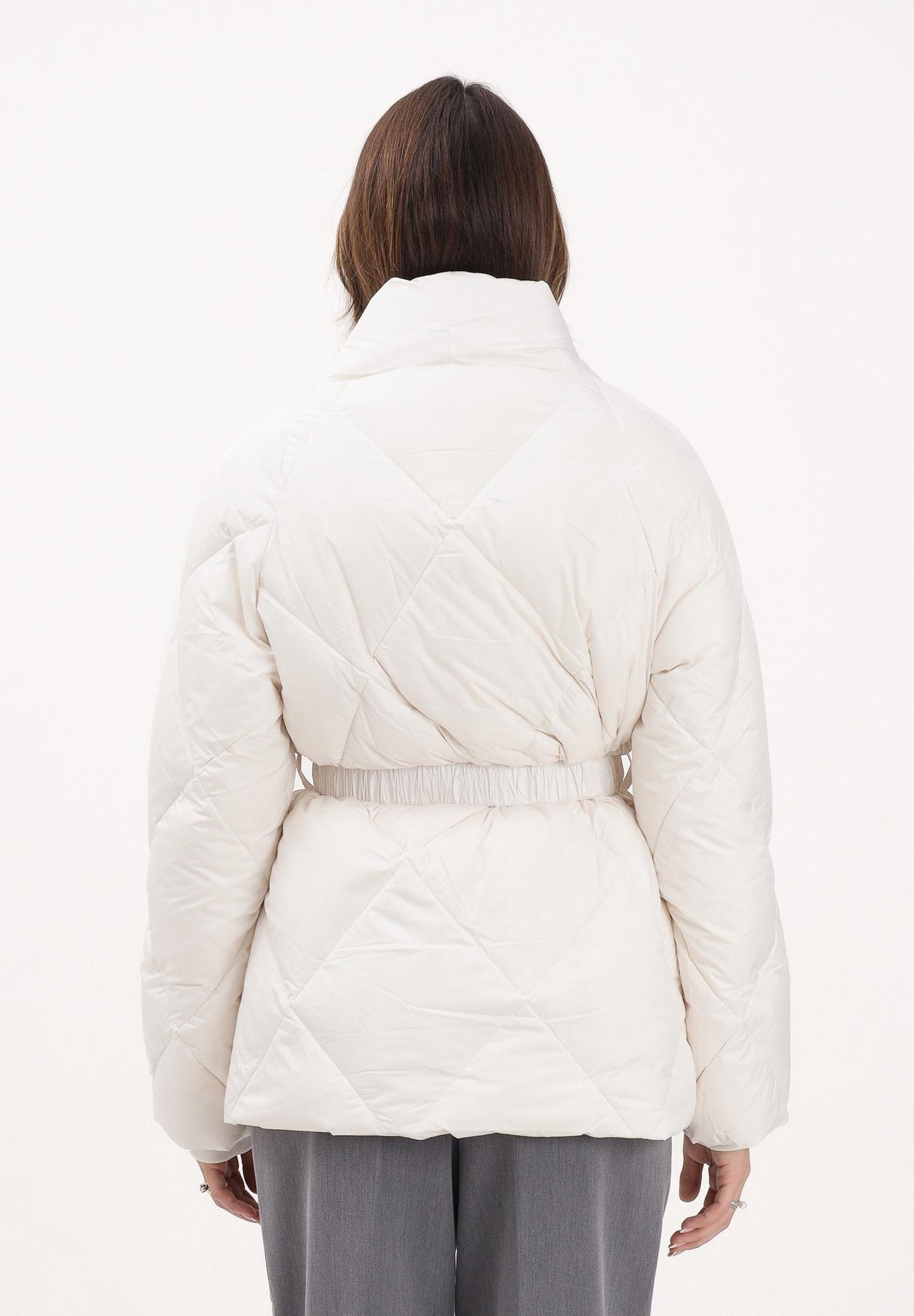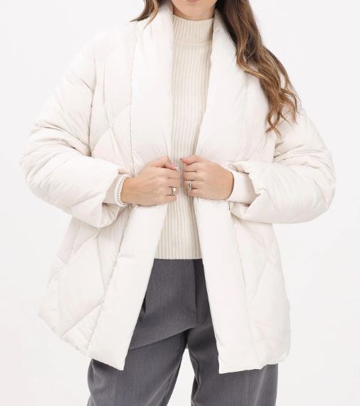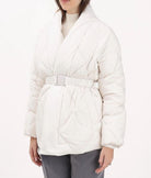 Piumino donna realizzato in tessuto tecnico leggero ma caldo, dal design raffinato e femminile. Il modello presenta una linea leggermente svasata con cuciture a motivo geometrico e un ampio collo sciallato che avvolge il collo con eleganza. La cintura in vita con fibbia tono su tono permette di definire la silhouette, mentre le maniche lunghe e le tasche laterali inserite completano il capo con praticità. Un capo versatile e sofisticato, ideale per affrontare la stagione fredda con stile e comfort.