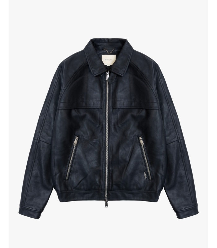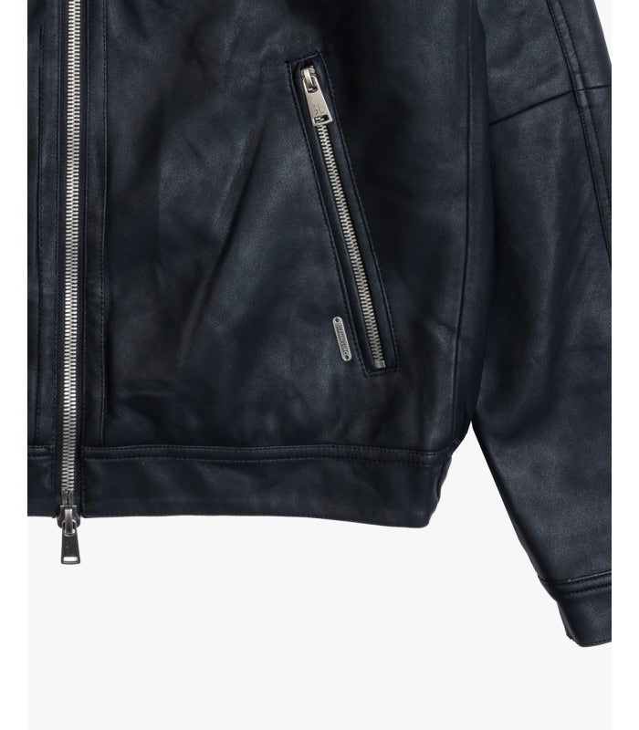 Giubbotto in ecopelle dallo stile vintage. Presenta maniche raglan una chiusura frontale con zip a doppio cursore, due tasche laterali con zip obliqua e colletto classico con dettaglio in metallo.