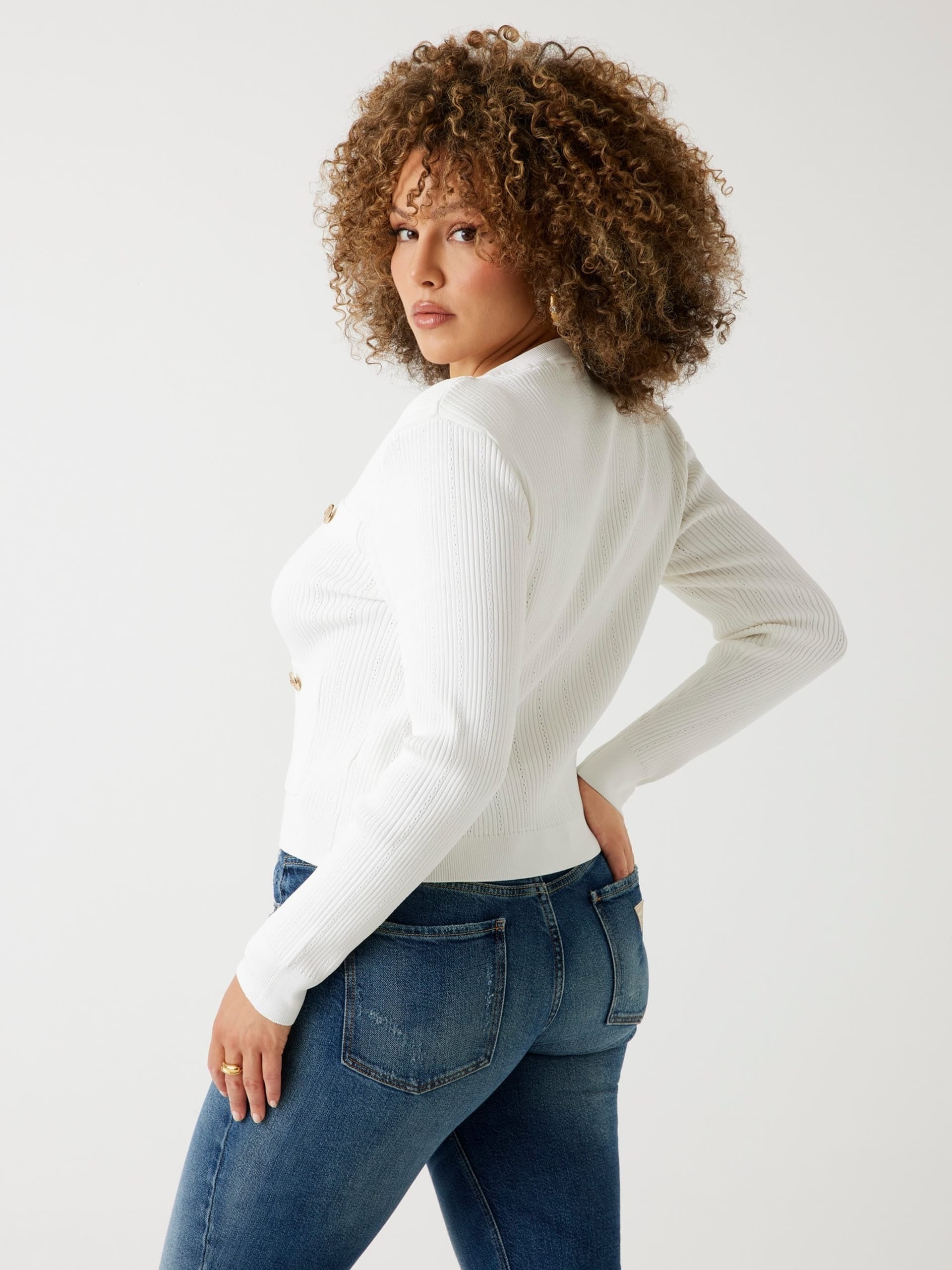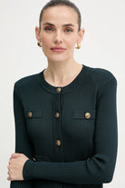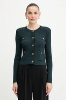 Cardigan donna Dona un tocco di sofisticatezza con questo cardigan in misto viscosa. Scollo rotondo, maniche lunghe e dettagli a coste verticali. Tasche frontali applicate aggiungono flair funzionale. Chiusura con bottoni. Ideale per incontri e eventi informali.