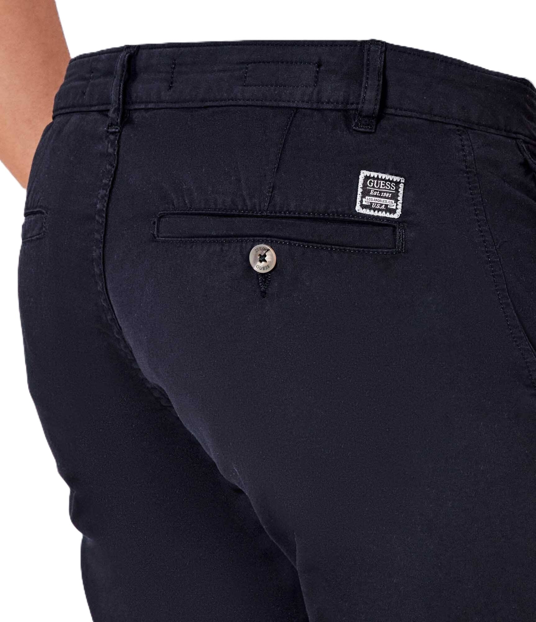 Tasche frontali oblique e tasche posteriori a filetto con bottone.