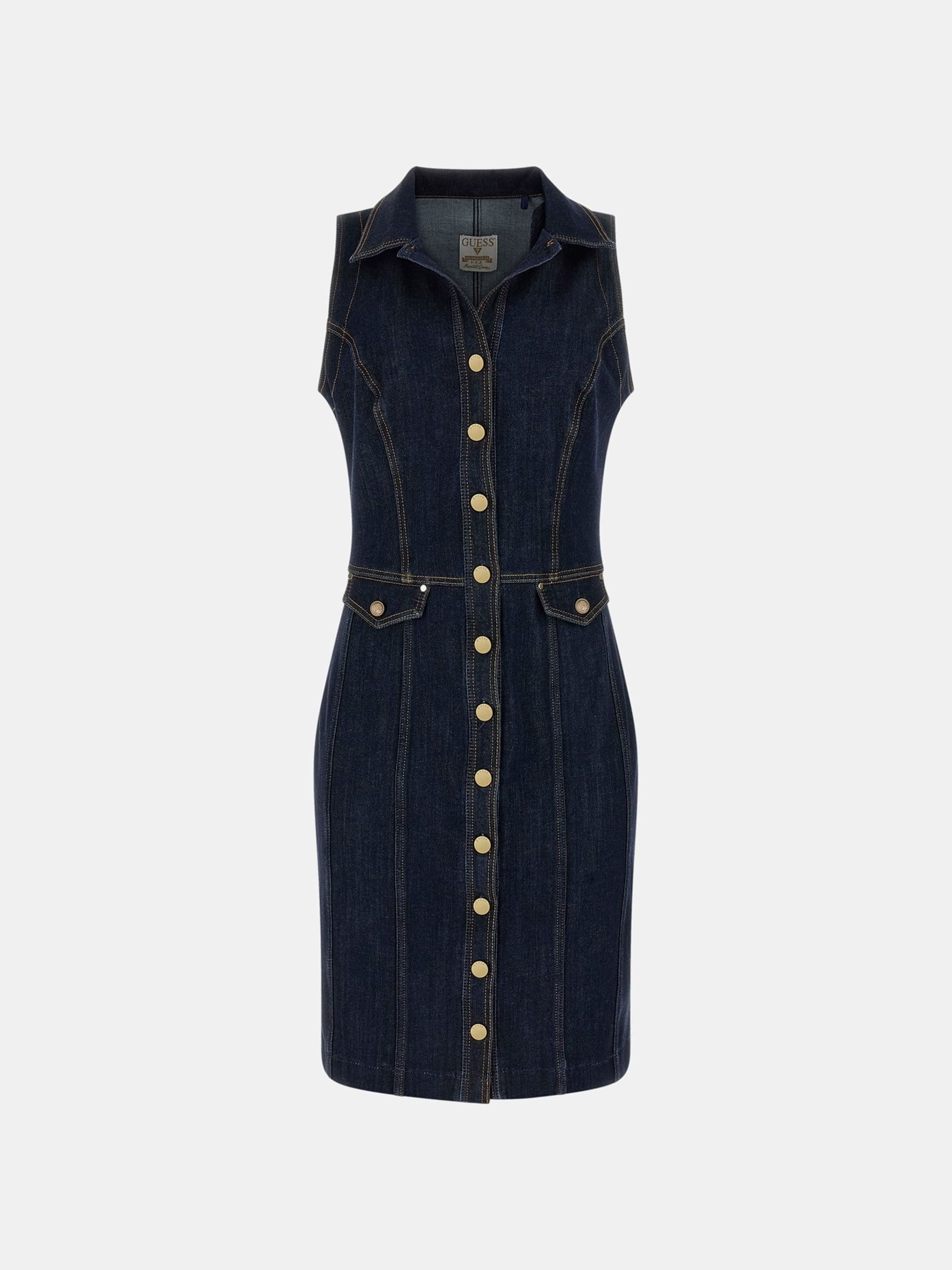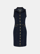 Vestito donna Svela la tua audacia con questa mini vestito bodycon in denim elasticizzato. Il suo taglio smanicato e il revers classico accentuano il fascino senza tempo. Dettagli di stile unici con tasche a patta, chiusura a bottoni frontale. Perfetto nelle città o serate informali per un look glam.