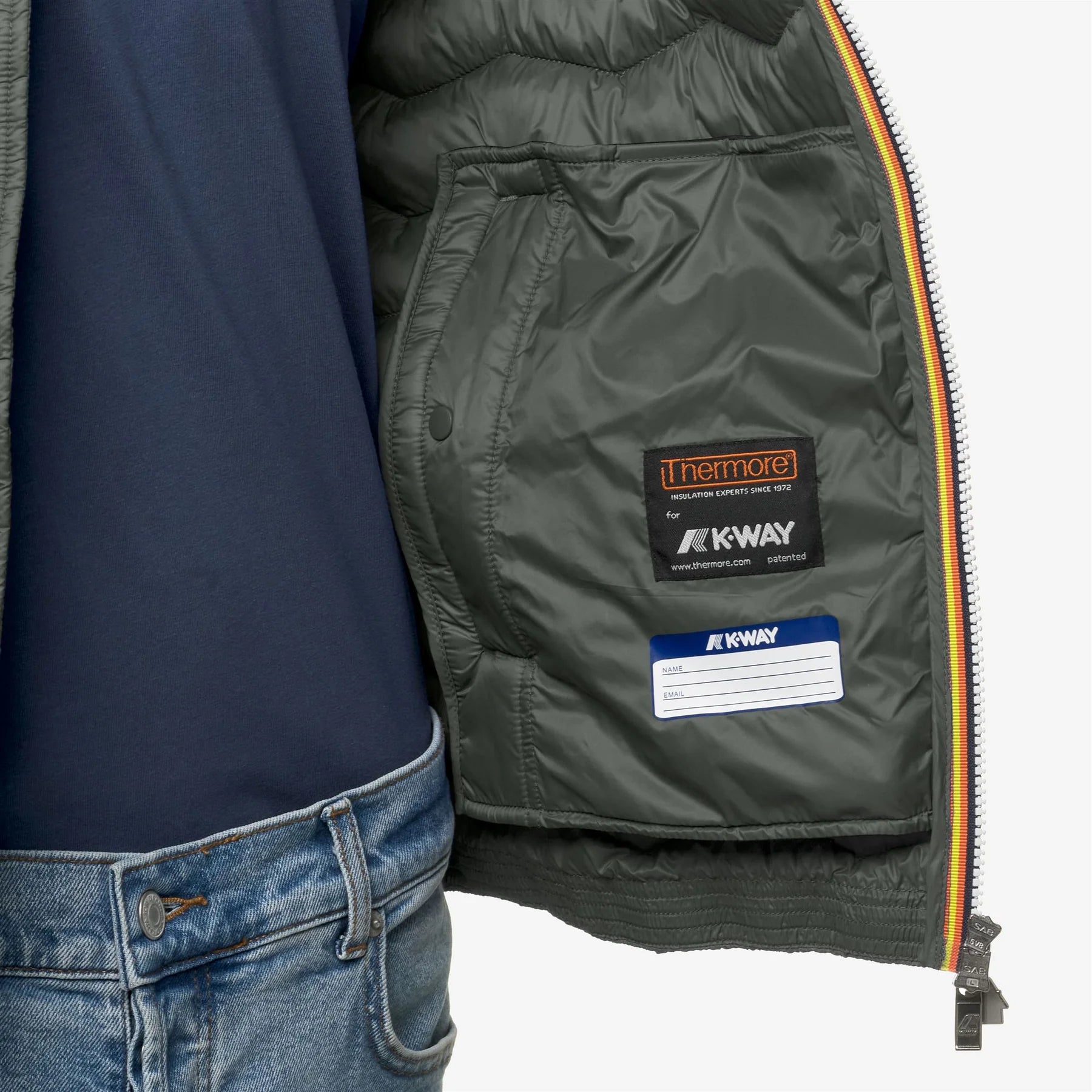 Jack è la classica giacca da uomo K-Way che dimostra l'impegno del brand per il rispetto della natura. Realizzato in nylon riciclato che protegge dall'acqua e dal vento, ha una trapuntatura a onde dall'effetto grafico distintivo. L’aspetto innovativo è l’imbottitura in Thermore®, una fibra ottenuta dalla plastica riciclata e altamente isolante.