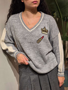 Maglia donna con scollo a V costine maniche lunghe con banda laterale a contrasto inserti sul petto