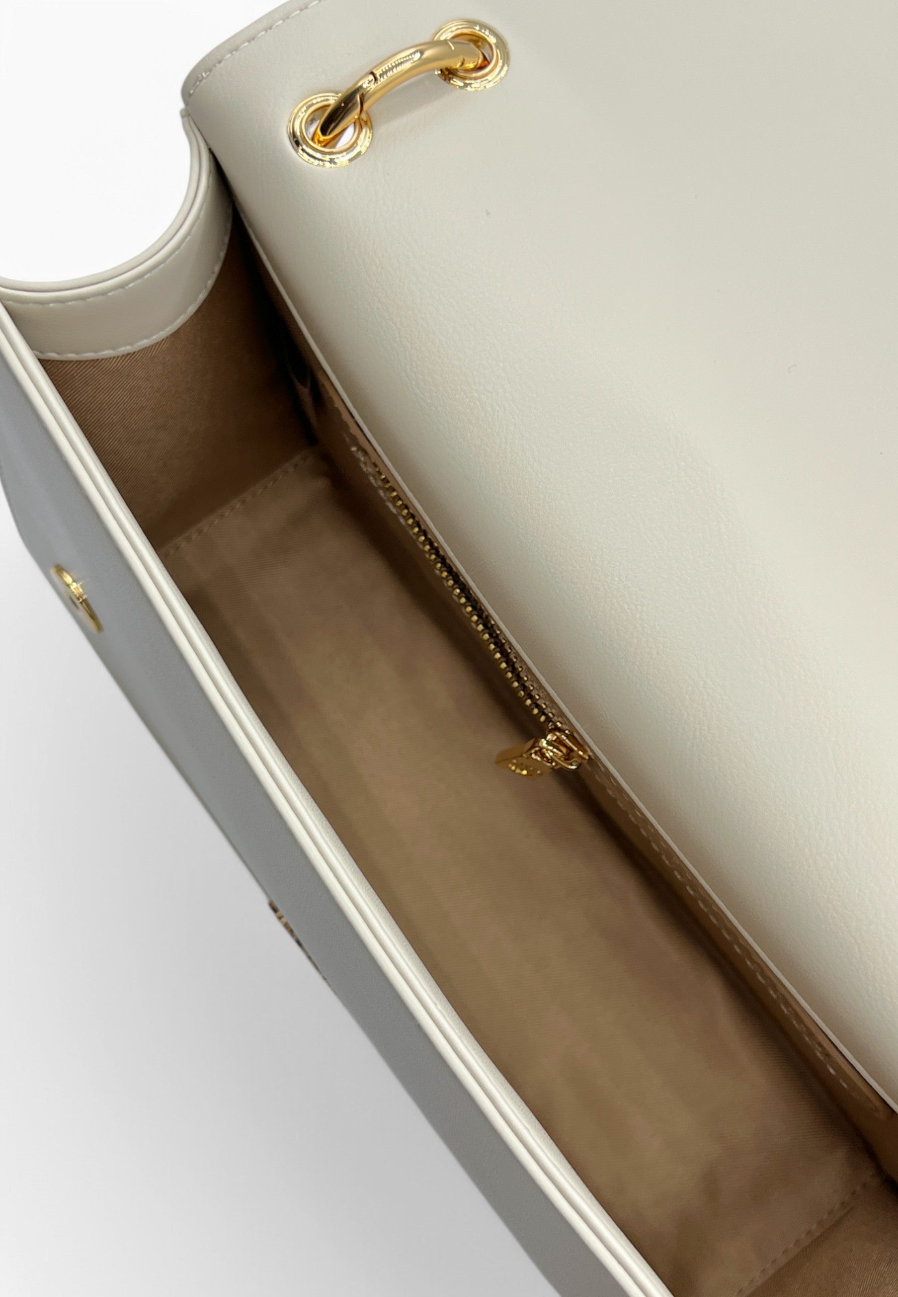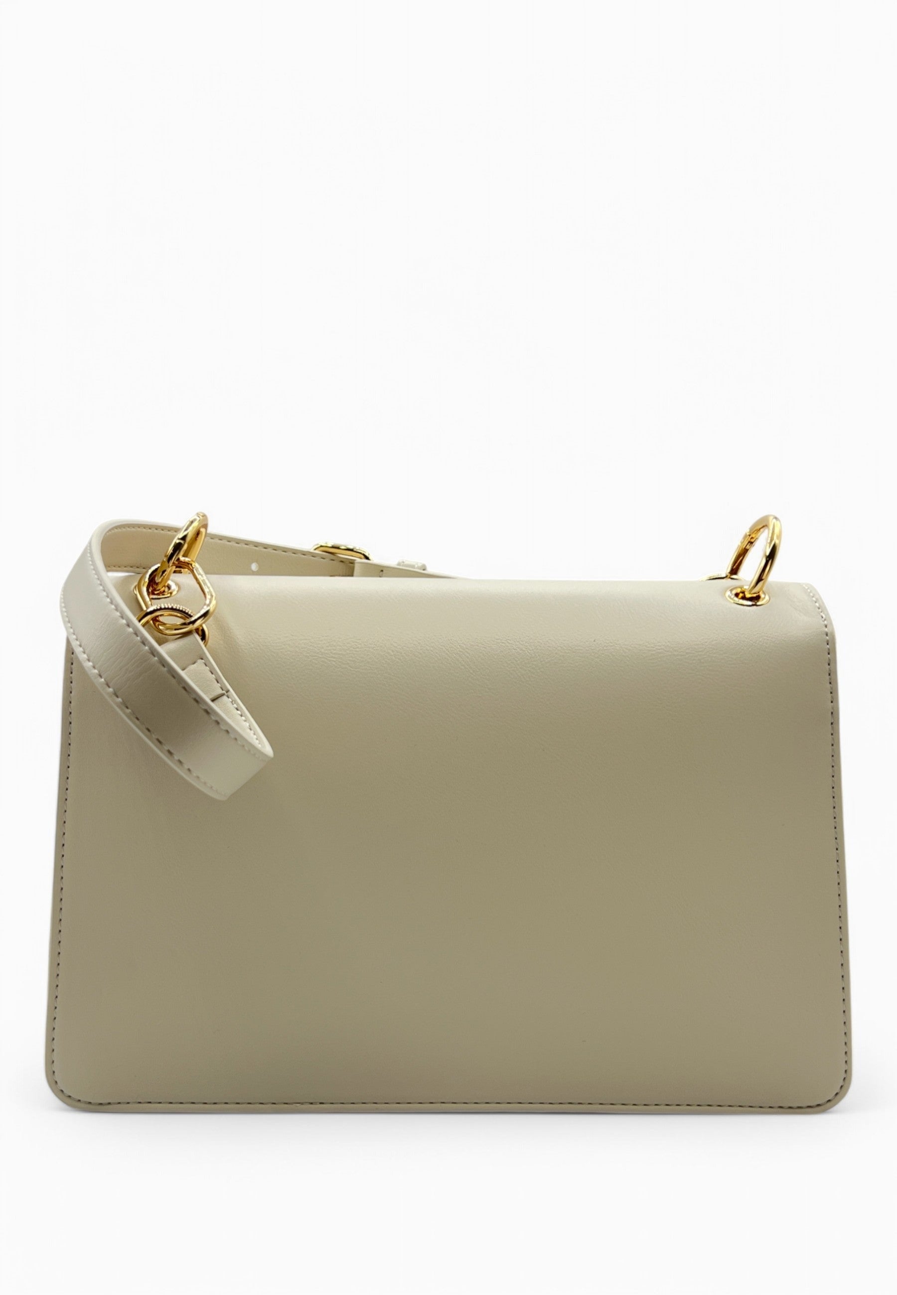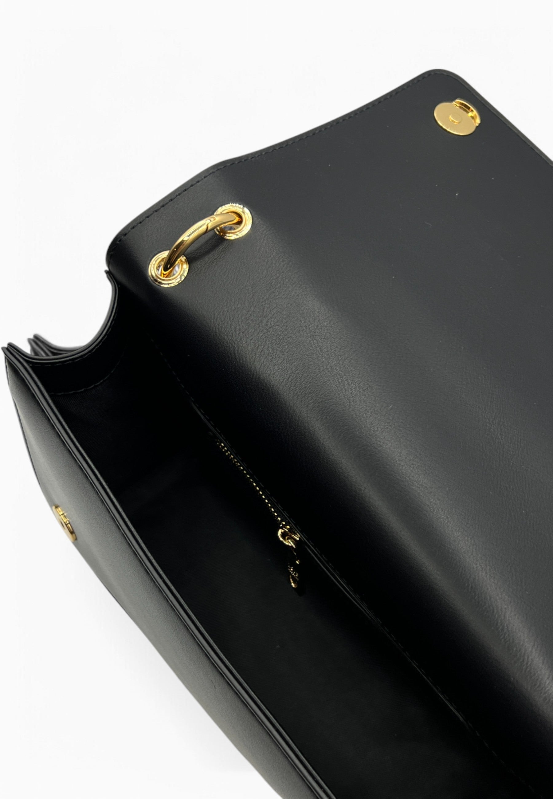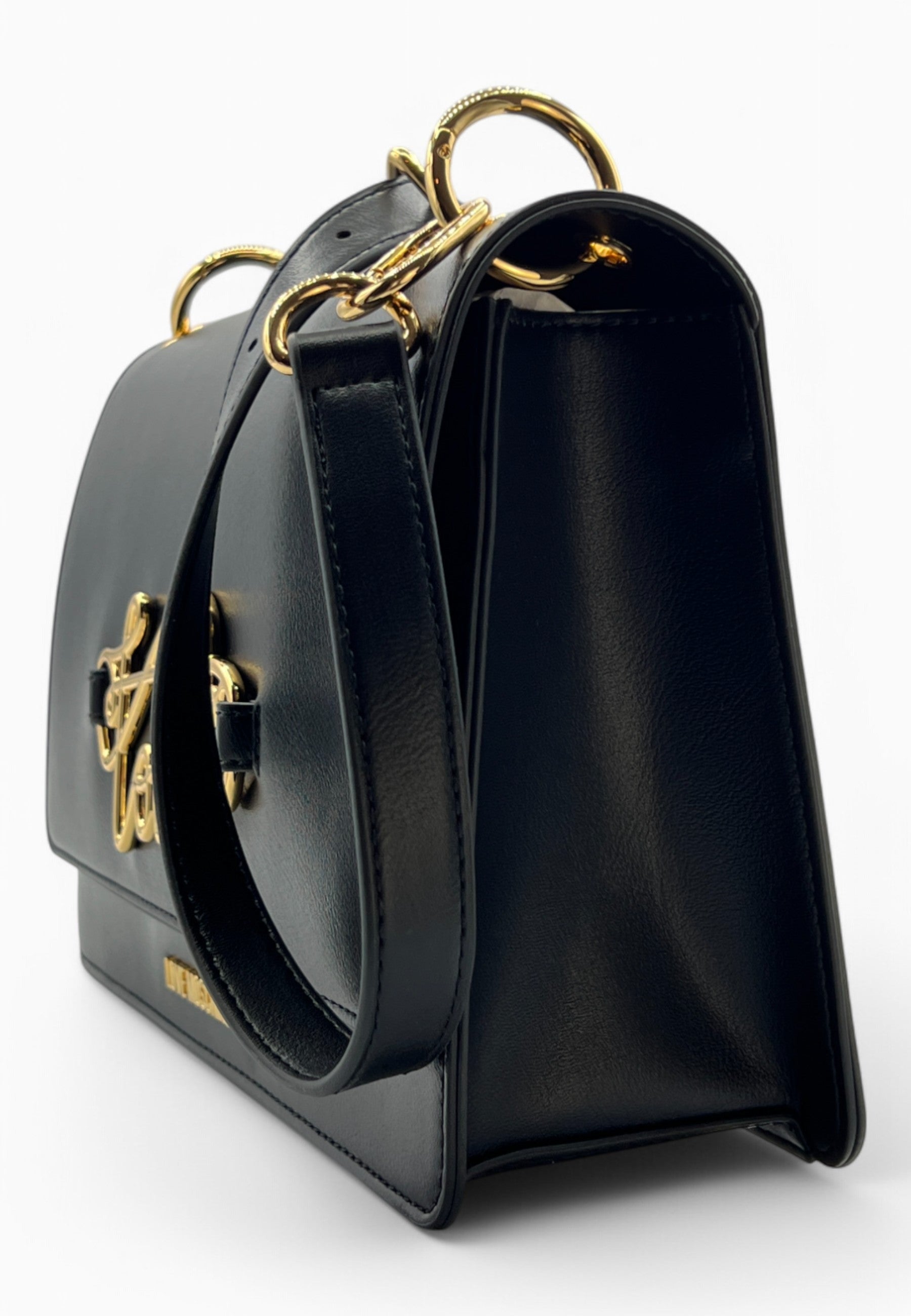 borsa donna a spalla realizzata in ecopelle. Placca "Love" in galvanica dorata sul davanti. Spallaccio in ecopelle con catena in galvanica dorata. Chiusura con patta e bottoni magnetici nascosti.