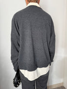 Design: Il pullover è caratterizzato da una lavorazione a maglia in un elegante colore antracite melange. Sul davanti spicca la scritta "AVENUE" in giallo senape e, subito sotto, "PARIS" in un tono di grigio più chiaro, entrambe realizzate con la tecnica dell'intarsio, che conferisce un tocco distintivo e di alta qualità.