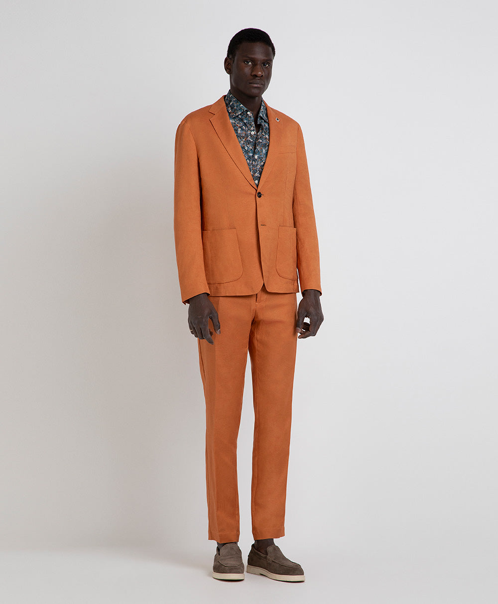Abito Markup in lino viscosa Blazer regular fit realizzato in tessuto di lino. Collo con revers a cran e maniche lunghe con polsino con bottoni. Taschino a filetto sul petto e tasche con patta sui fianchi. Dettaglio di tasca interna. Orlo con spacchi posteriori. Chiusura frontale con bottoni. Pantaloni regular fit realizzati in tessuto di lino. Tasche anteriori e dettaglio di tasche posteriori a filetto. Chiusura frontale con cerniera e bottone.