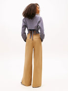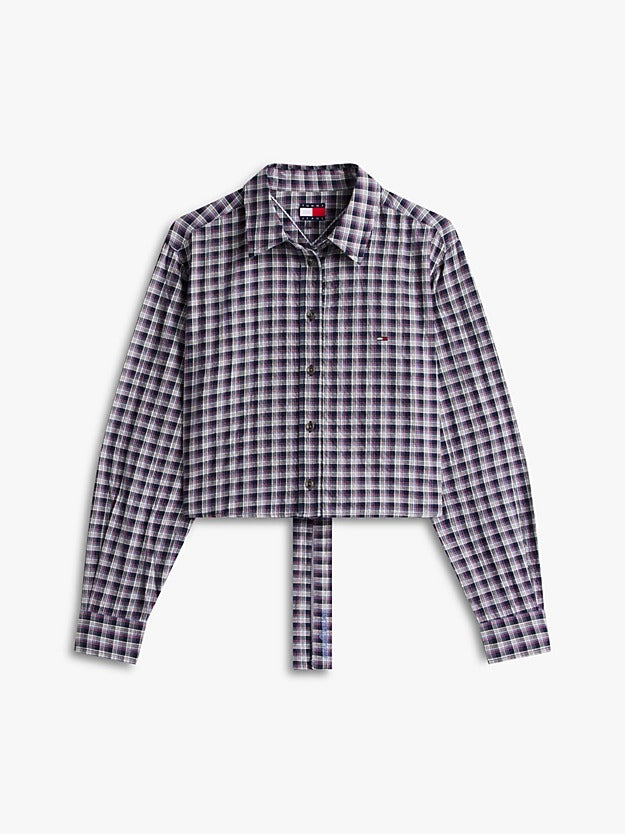 Camicia donna realizzata in twill seersucker di cotone stretch con motivo a quadri tartan, si distingue per l'originale dettaglio con laccetti da annodare sulla parte posteriore.