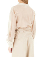 Camicia donna in lyocel con collo revers senza bottoni con chiusura incrociata e fiocco maniche a sbuffo polsino alto con bottoni