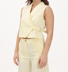 Gilet donna presenta un raffinato scollo rever incrociato con morbido, che richiama lo stile del blazer rivisitato in chiave femminile e moderna. La cintura laterale con anello metallico consente di regolare la vestibilità, valorizzando il punto vita e donando struttura alla silhouette. Il taglio corto lo rende perfetto da abbinare a pantaloni coordinati o a vita alta, per un look deciso e sofisticato. Un capo versatile e chic, ideale per outfit da ufficio moderni, eventi o look serali dal gusto minimal ed elegante.