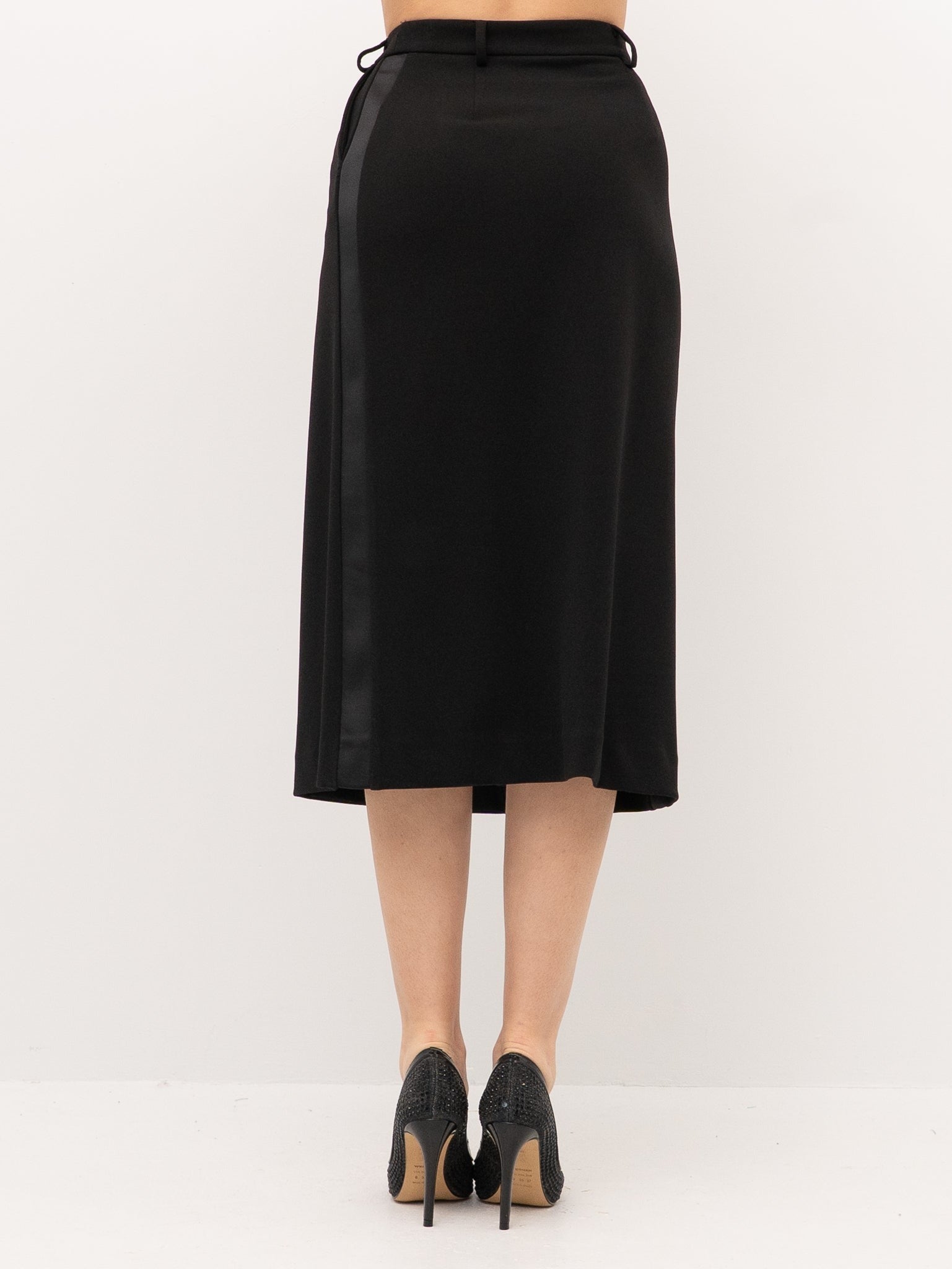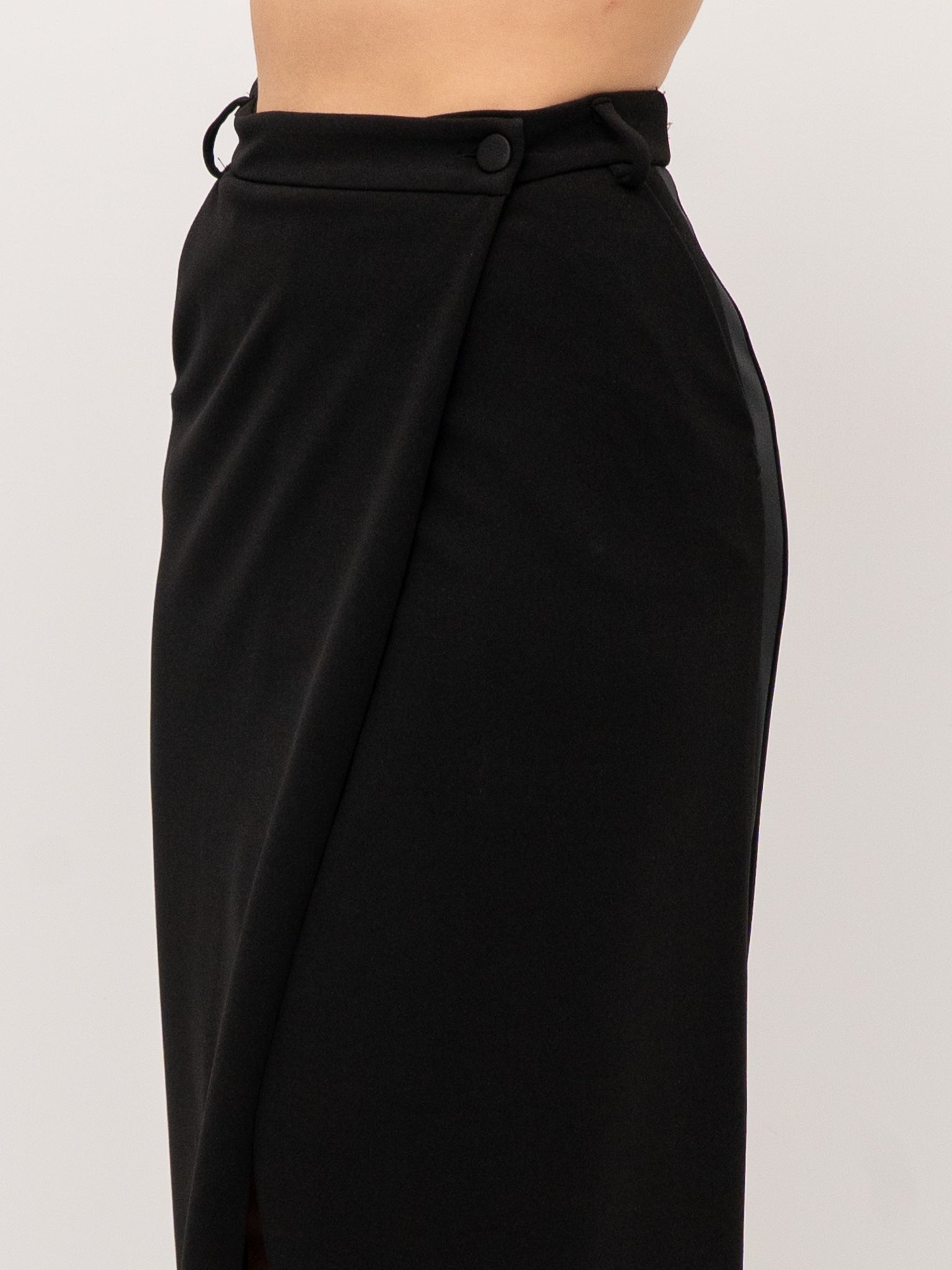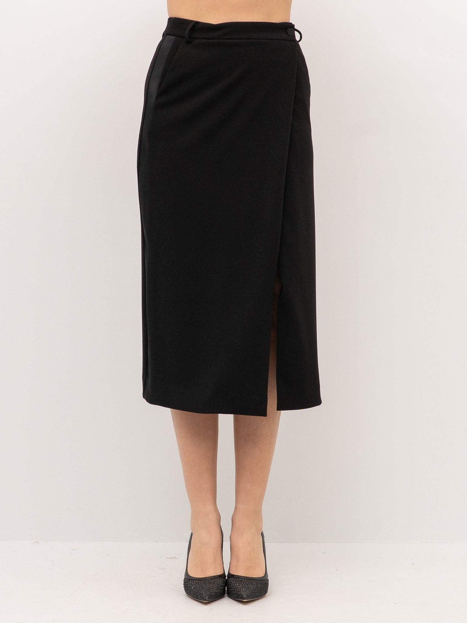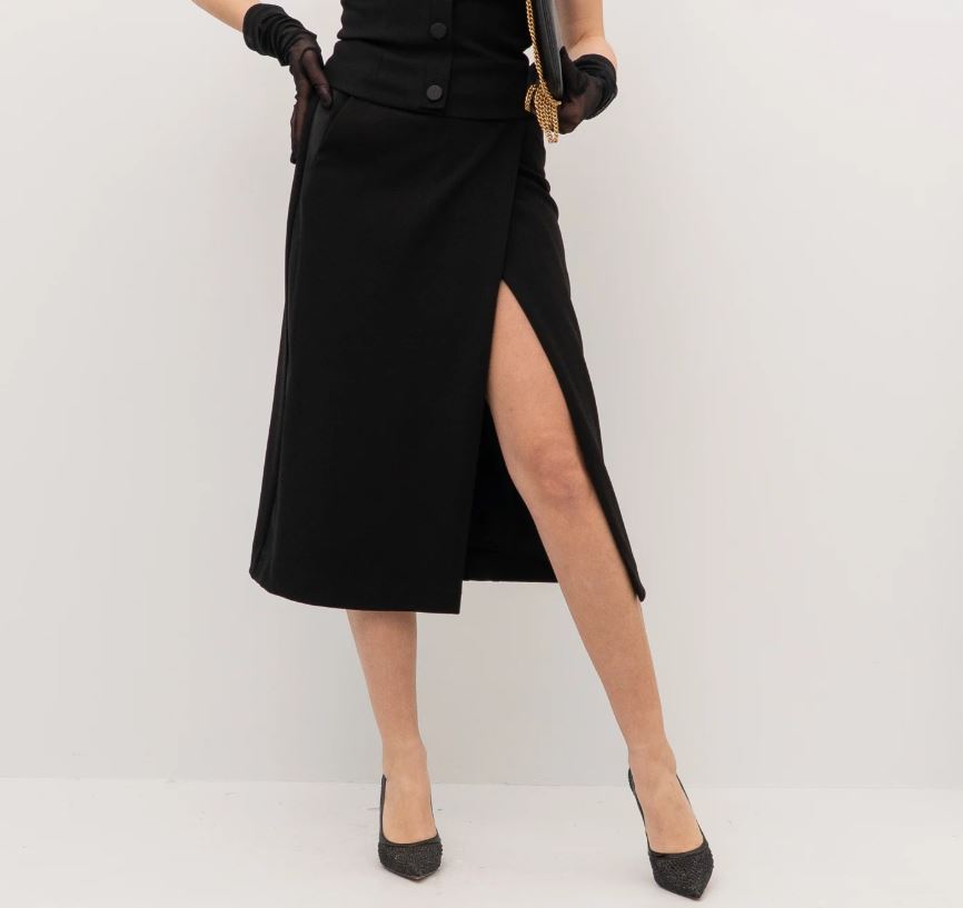 Dettagli: Gonna a portafoglio con spacco frontale, linea pulita ed elegante, inserto laterale a contrasto che slancia la silhouette