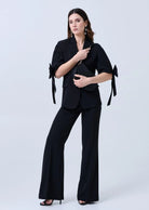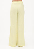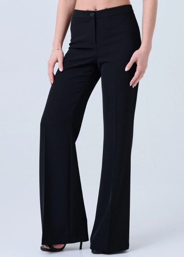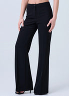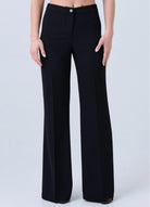 Pantalone donna elegante modello palazzo con gamba ampia e dritta che slancia la silhouette a vita alta. Realizzato in tessuto fluido e compatto, cade in modo impeccabile accompagnando il movimento. La linea è pulita ed essenziale, con chiusura frontale discreta e cuciture verticali che valorizzano la figura.
