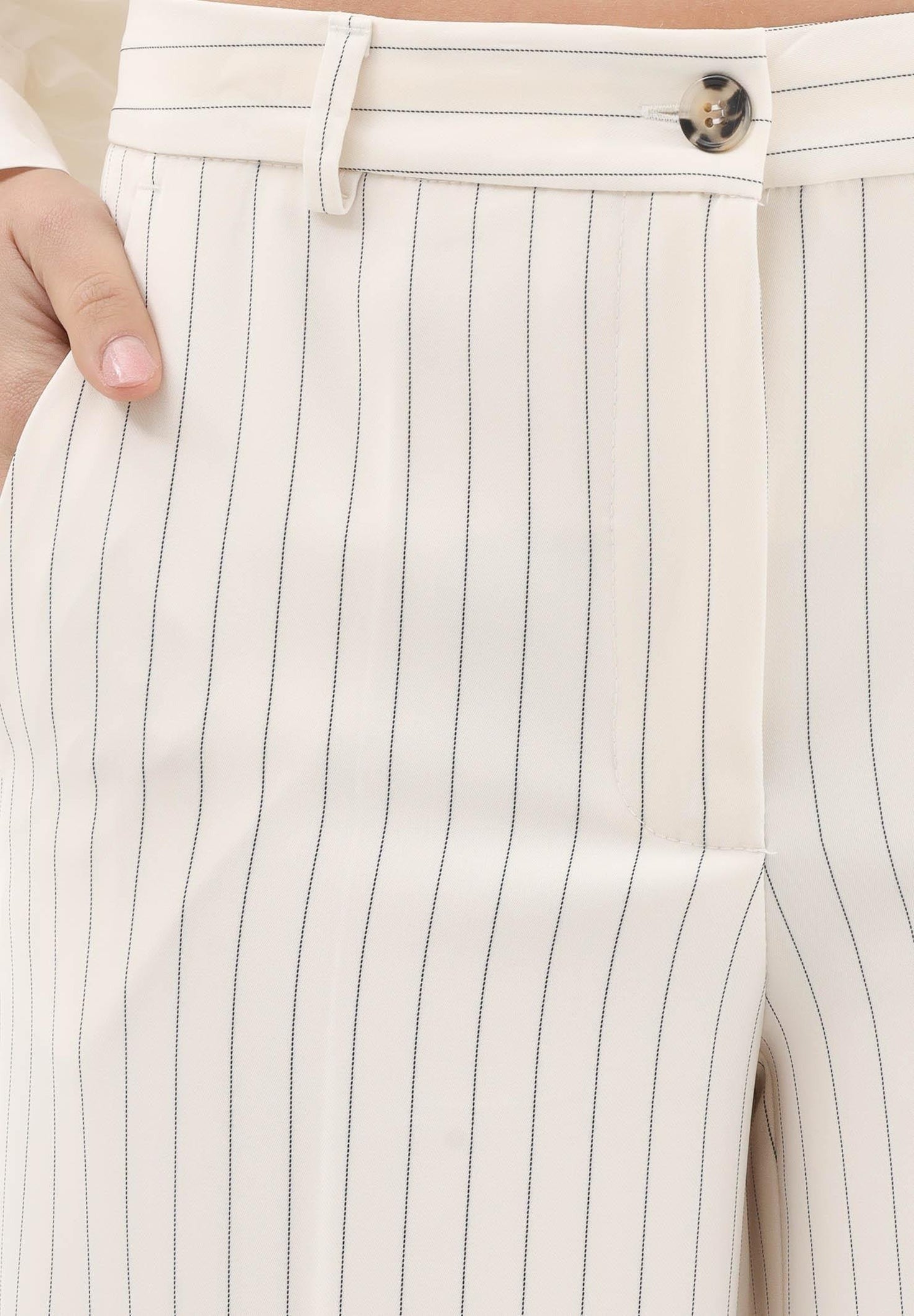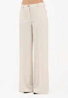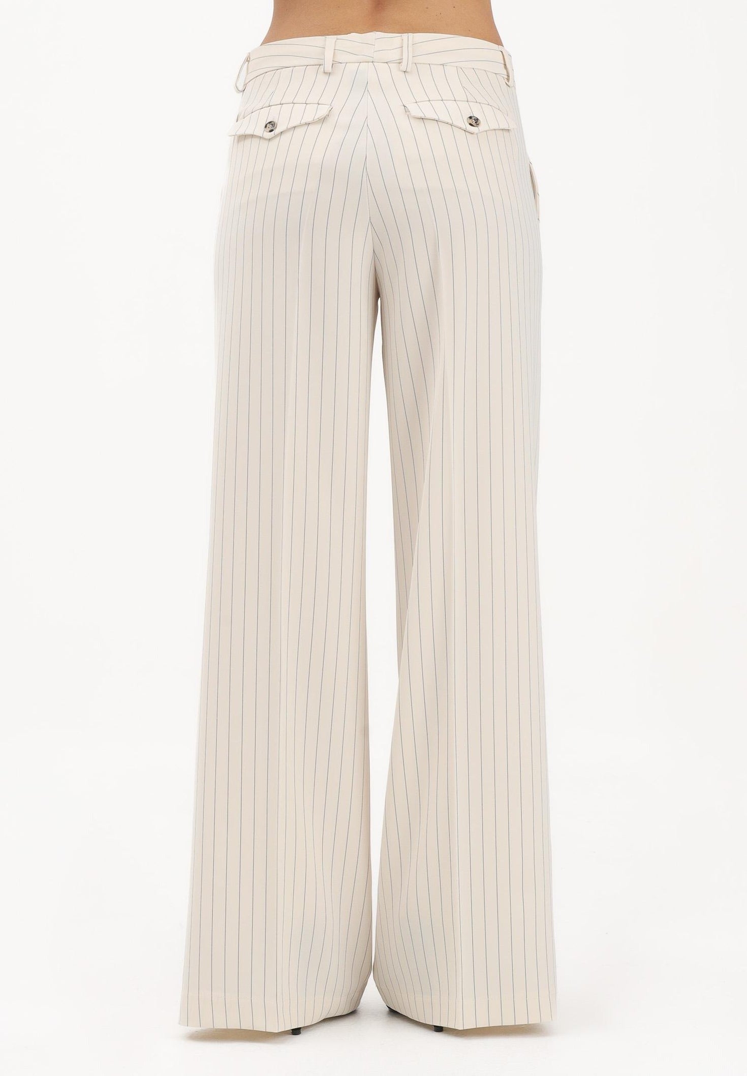 Pantalone donna motivo gessato con taglio ampio e scivolato, caratterizzato da una linea elegante e pulita. Realizzato in tessuto chiaro con raffinata gessatura verticale a contrasto, slancia visivamente la figura e dona un'allure sartoriale. La gamba è dritta e larga, con fondo morbido che accompagna il movimento, mentre la struttura è definita da passanti per cintura e chiusura frontale con bottone. Sul retro presenta tasche a filetto con pattina e bottone, dettaglio