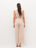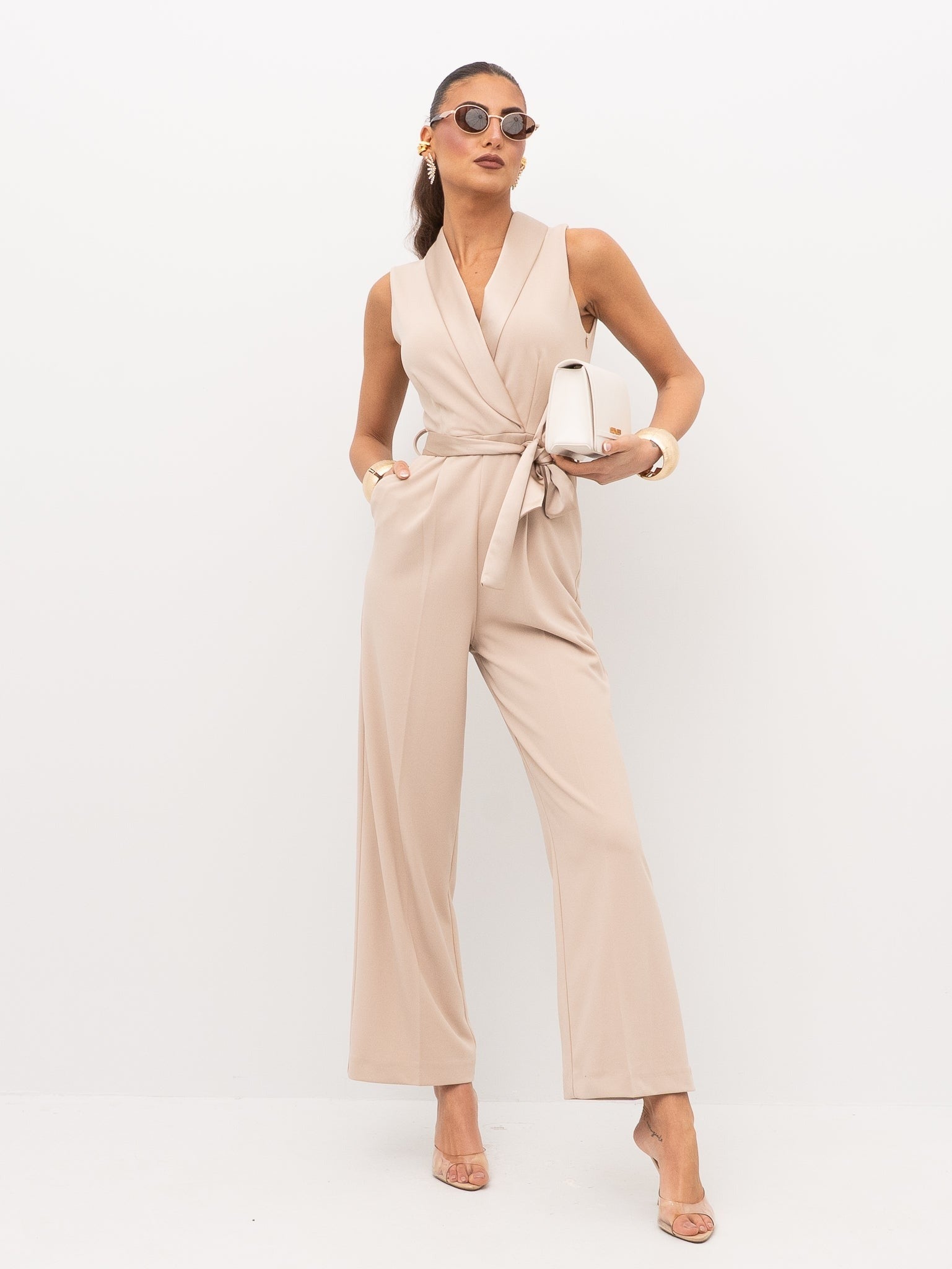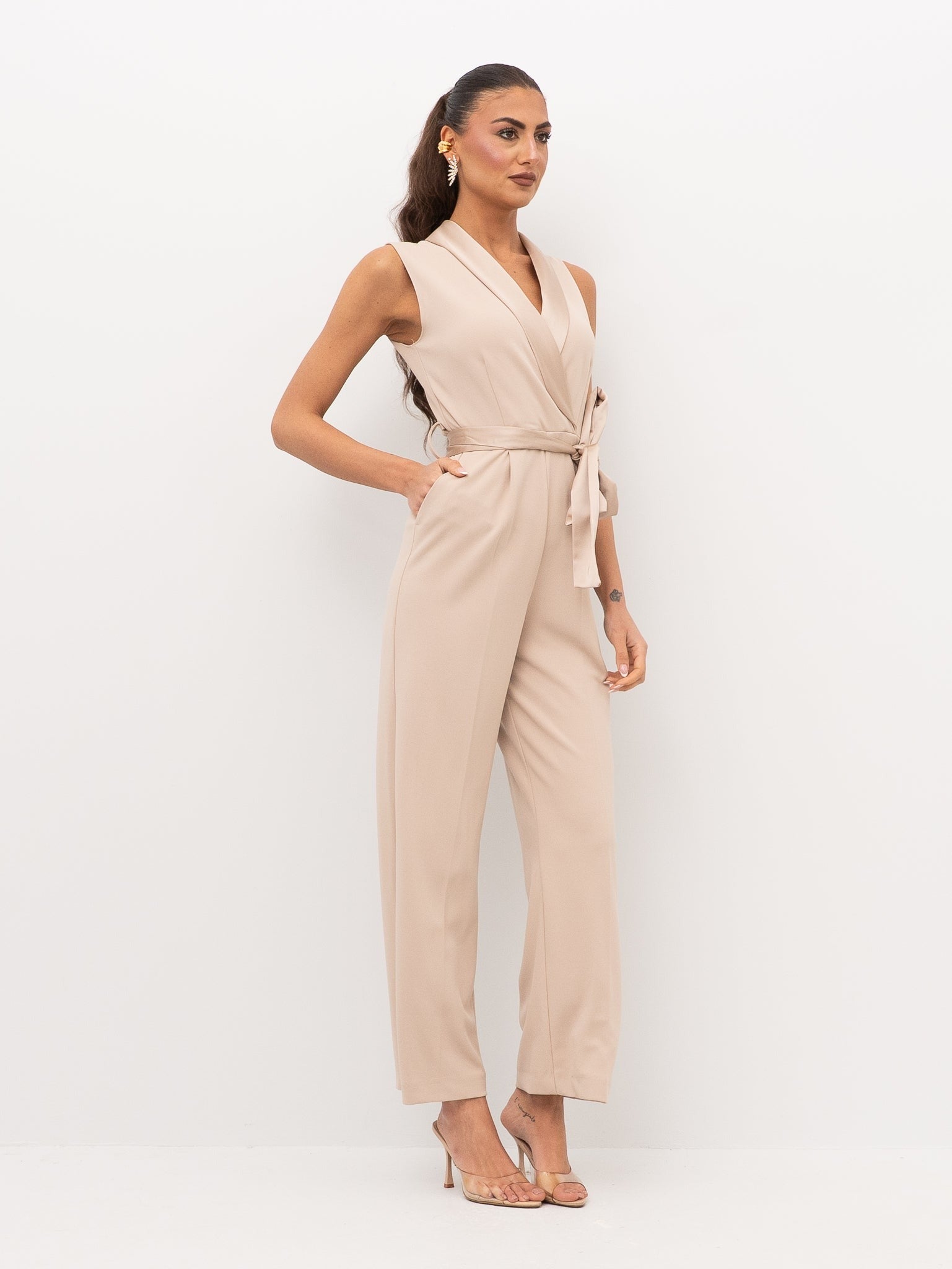 con collo rever strutturato, chiusura incrociata sul davanti, fascia in vita da annodare, pinces verticali su busto e pantalone, linea pulita senza applicazioni