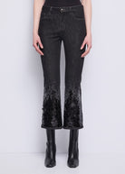 i jeans flare cropped in cotone elasticizzato con paillettes al fondo. Modello a vita alta per un look scintillante dal fascino glamour.