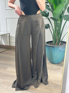 Pantalone donna elasticizzato in vita, chiusura laterale con cerniera effetto satinato, gamba ampia con dettaglio spacchi frontali.