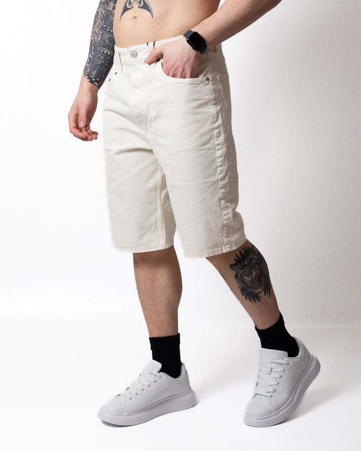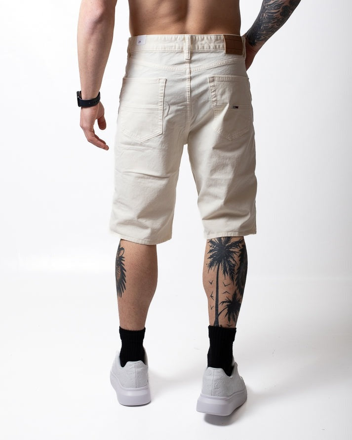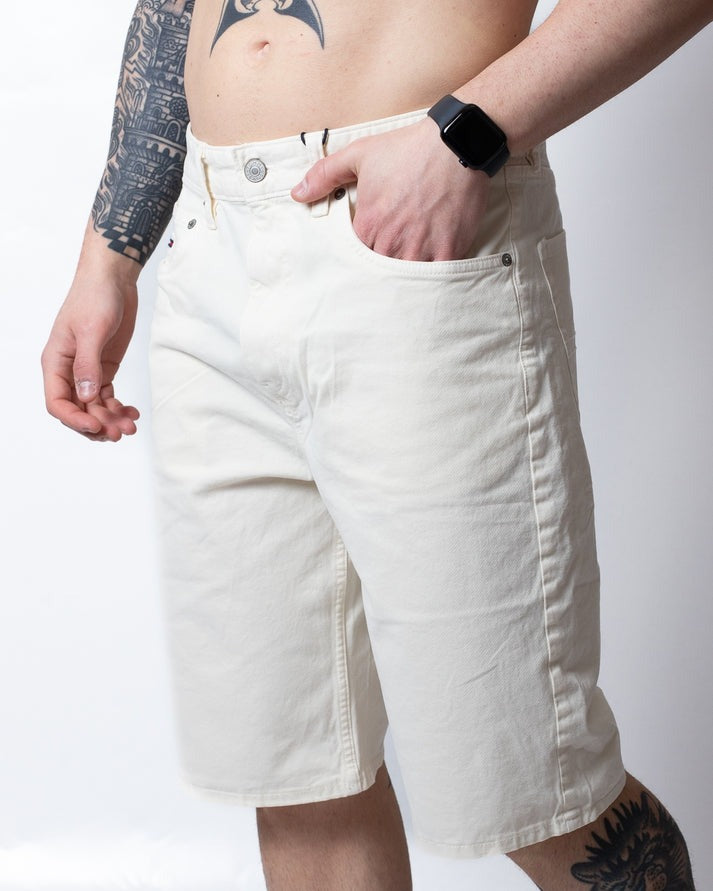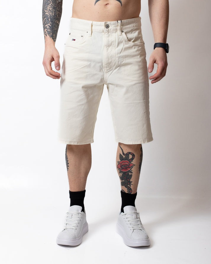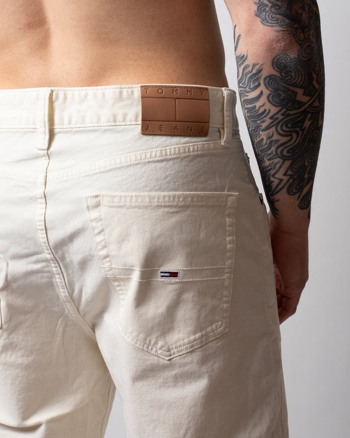 Bermuda Tommy Jeans denim bianco, unica variante. Design cinque tasche, chiusura frontale con bottone e zip, passanti in vita per cintura, logo bandiera ricamato sul davanti e patch logata ricamata sul retro. Codice Articolo: DM0DM21953YBH https://nz.tommy.com/size_guide_mens